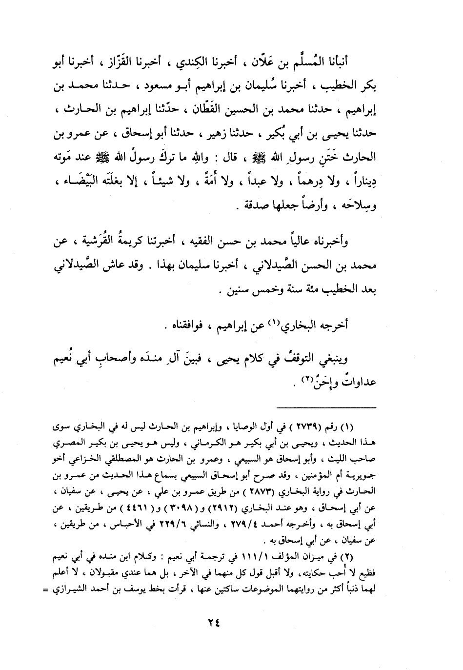 (1) رقم (2739) في أول الوصايا، وإبراهيم بن الحارث ليس له في البخاري سوى هذا الحديث، ويحيى بن أبي بكير هو الكرماني، وليس هو يحيى بن بكير المصري صاحب الليث، وأبو إسحاق هو السبيعي، وعمرو بن الحارث هو المصطلقي الخزاعي أخو جويرية أم المؤمنين، وقد صرح أبو إسحاق السبيعي بسماع هذا الحديث من عمرو بن الحارث في رواية البخاري (2873) من طريق عمرو بن علي، عن يحيى، عن سفيان، عن أبي إسحاق، وهو عند البخاري (2912) و (3098) و (4461) من طريقين، عن أبي إسحاق به، وأخرجه أحمد 4 / 279، والنسائي 6 / 229 في الاحباس، من طريقين، عن سفيان، عن أبي إسحاق به.