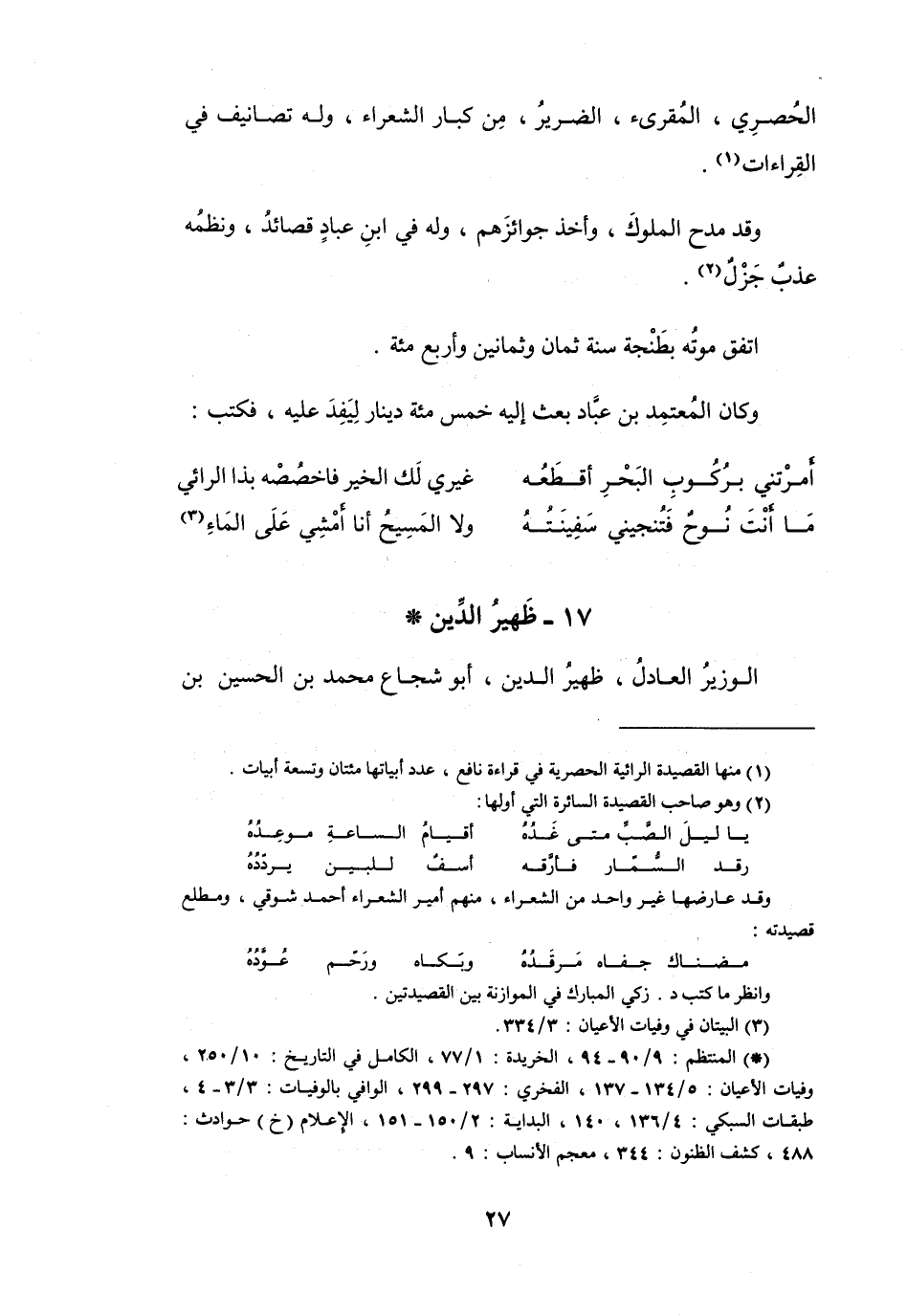 (*) المنتظم: 9 / 90 - 94، الخريدة: 1 / 77، الكامل في التاريخ: 10 / 250، وفيات الأعيان: 5 / 134 - 137، الفخري: 297 - 299، الوافي بالوفيات: 3 / 3 - 4، طبقات السبكي: 4 / 136، 140، البداية: 2 / 150 - 151، الاعلام (خ) حوادث: 488، كشف الظنون: 344، معجم الأنساب: 9.