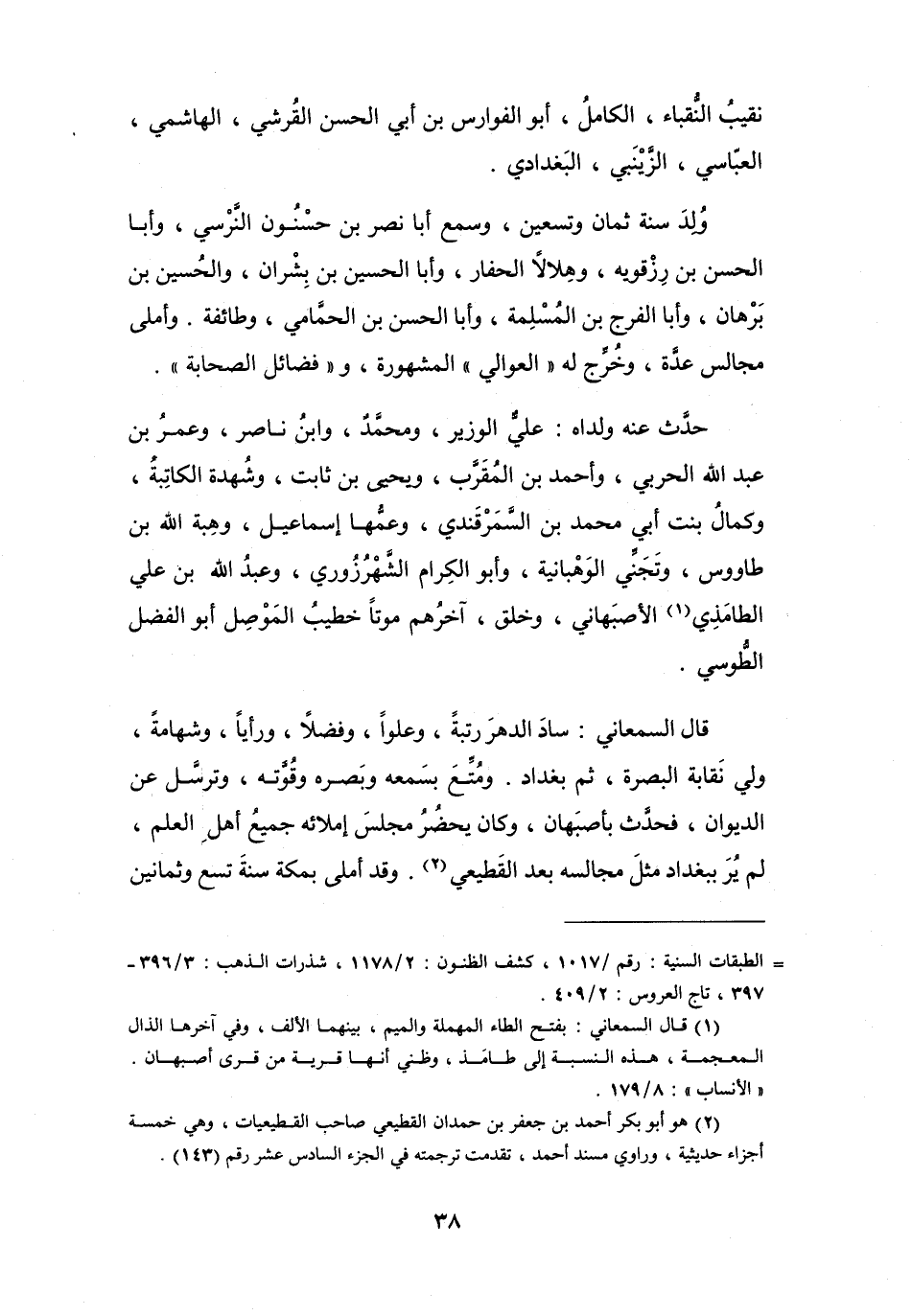 (2) هو أبو بكر أحمد بن جعفر بن حمدان القطيعي صاحب القطيعيات، وهي خمسة أجزاء حديثية، وراوي مسند أحمد، تقدمت ترجمته في الجزء السادس عشر رقم (143) .
