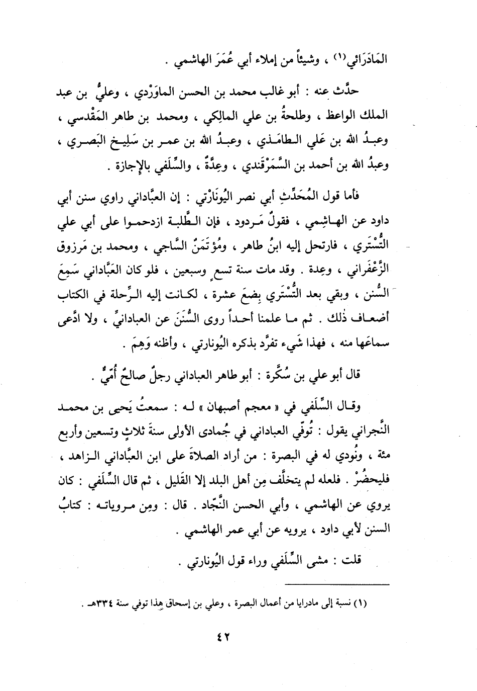 ثُمَّ مَا علمنَا أَحَداً رَوَى (السُّنَن) عَنِ العَبَّادَانِي، وَلاَ ادَّعَى سَمَاعهَا مِنْهُ، فَهَذَا شَيْء تَفَرَّد بِذكرِهِ اليُونَارتِي، وَأَظُنُّهُ وَهِمَ.
