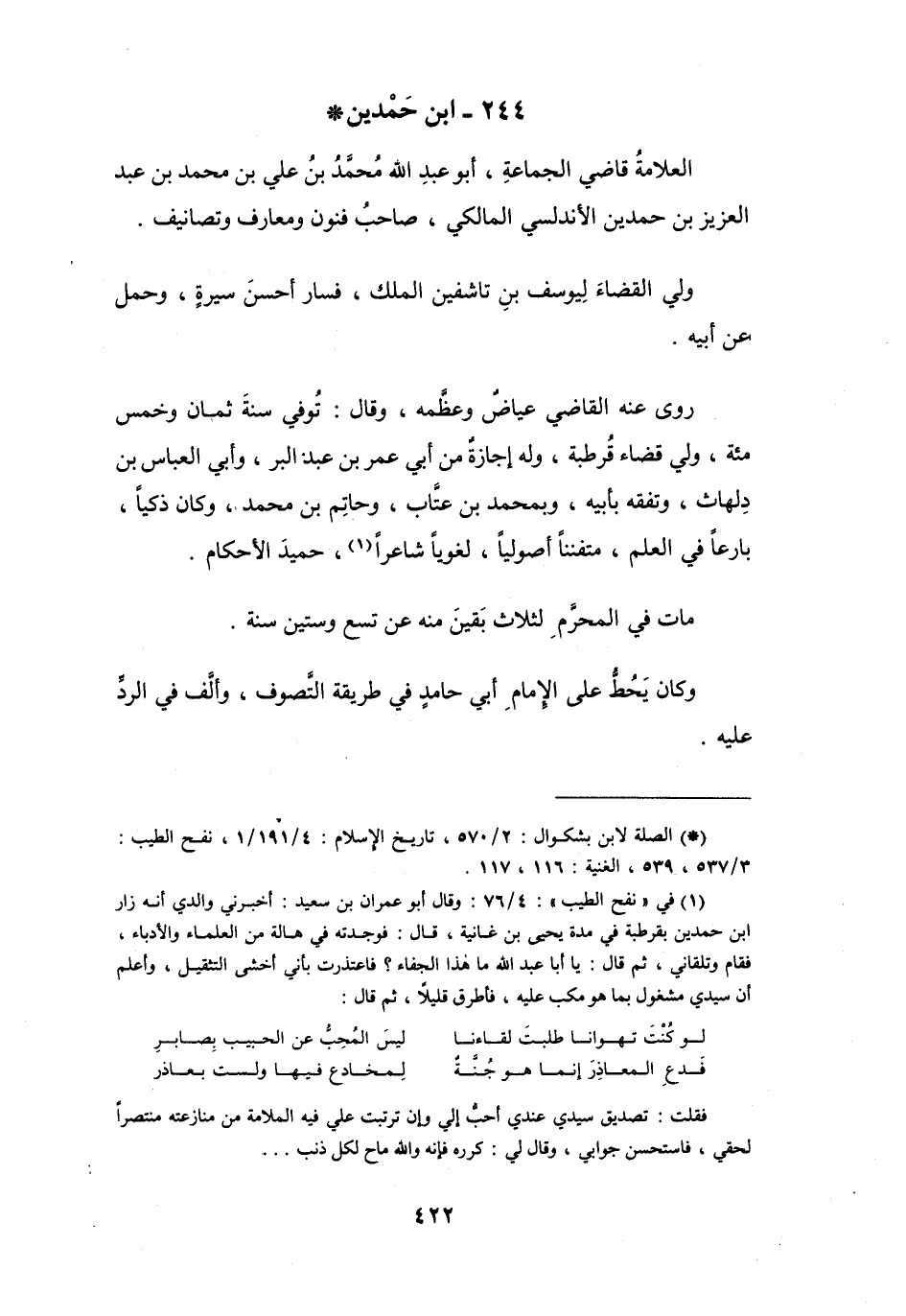 (*) الصلة لابن بشكوال: 2 / 570، تاريخ الإسلام: 4 / 191 / 1، نفح الطيب: 3 / 537، 539، الغنية: 116، 117.