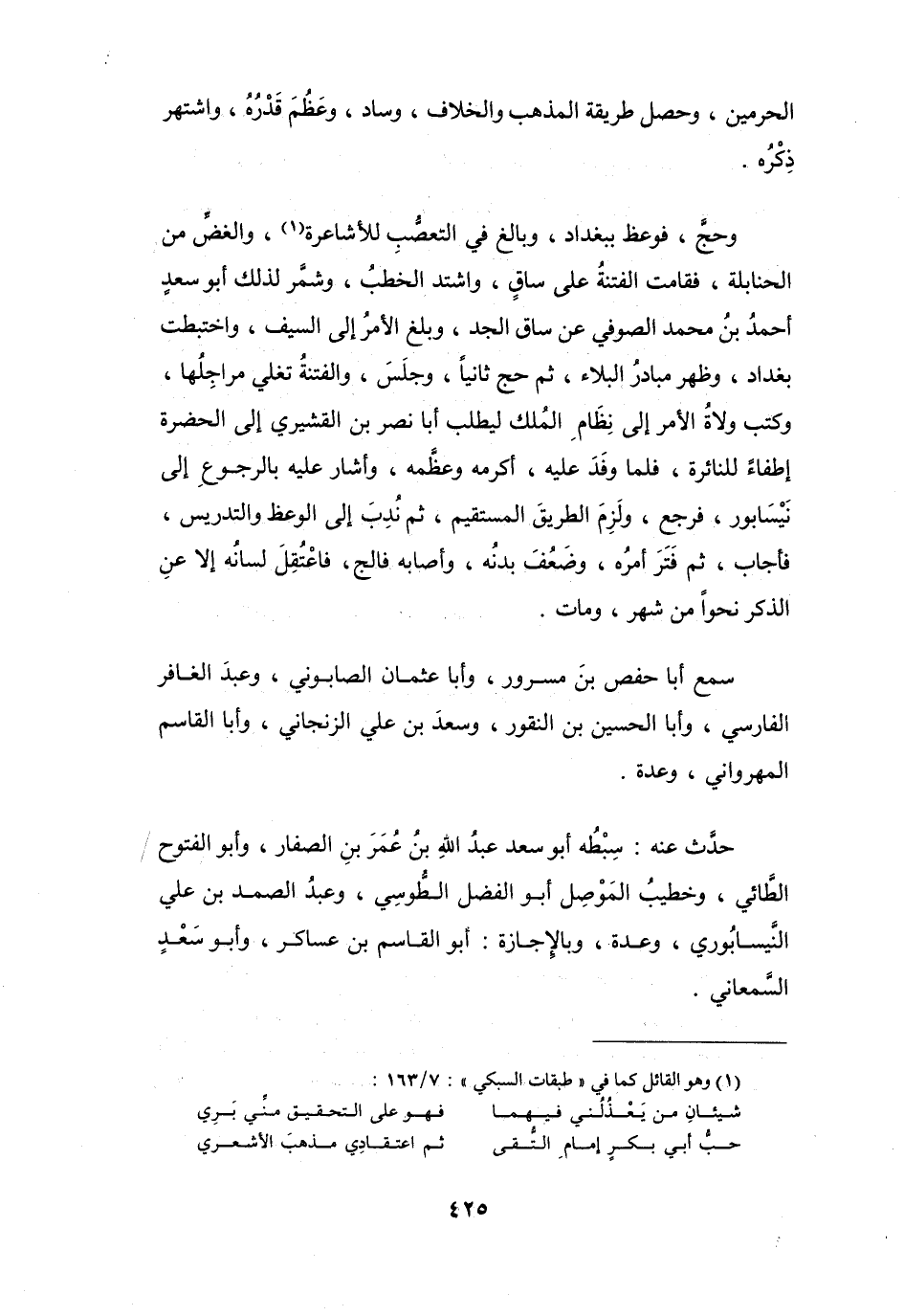 وَحَجَّ، فَوَعَظ بِبَغْدَادَ، وَبَالَغَ فِي التَّعَصُّبِ لِلأَشَاعِرَة (1) ، وَالغضِّ مِنَ الحنَابلَةِ، فَقَامَتِ الفِتْنَةُ عَلَى سَاقٍ، وَاشتَدَّ الخطبُ، وَشَمَّرَ لِذَلِكَ أَبُو سَعْدٍ أَحْمَدُ بنُ مُحَمَّدٍ الصُّوْفِيّ عَنْ سَاق الجدّ، وَبَلغَ الأَمْرُ إِلَى السَّيْفِ، وَاختَبَطَتْ بَغْدَادُ، وَظَهَرَ مُبَادرُ البَلاَء، ثُمَّ حَجَّ ثَانِياً، وَجَلَسَ، وَالفِتْنَةُ تَغلِي مَرَاجِلُهَا، وَكَتَبَ وُلاَةُ الأَمْرِ إِلَى نِظَامِ المُلك لِيَطلُبَ أَبَا نَصْرٍ بنَ القُشَيْرِيِّ إِلَى الحضرَةِ إِطفَاءً لِلنَّائِرَةِ، فَلَمَّا وَفَدَ عَلَيْهِ، أَكرمه وَعَظَّمه، وَأَشَارَ عَلَيْهِ بِالرُّجُوْعِ إِلَى نَيْسَابُوْرَ، فَرَجَعَ، وَلَزِمَ الطَّرِيْقَ المُسْتَقِيمَ، ثُمَّ نُدِبَ إِلَى الوَعظِ وَالتَّدرِيسِ، فَأَجَابَ، ثُمَّ فَتَرَ أَمرُه، وَضَعُفَ بَدَنُه، وَأَصَابَهُ فَالِج، فَاعْتُقِلَ لِسَانُه إِلاَّ عَنِ الذِّكر نَحْواً مِنْ شهر، وَمَاتَ.