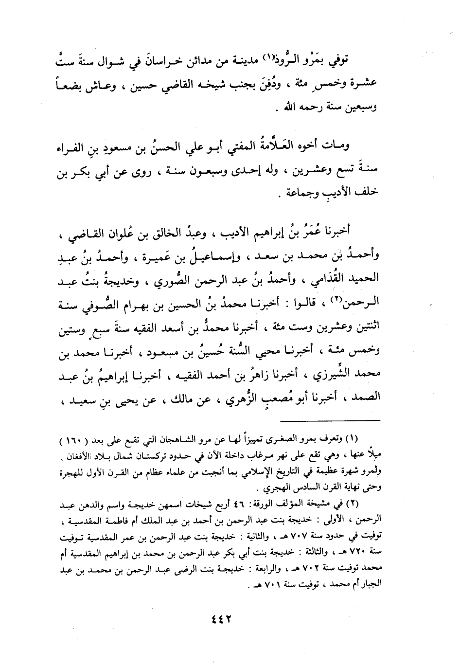 (2) في مشيخة المؤلف الورقة: 46 أربع شيخات اسمهن خديجة واسم والدهن عبد الرحمن، الأولى: خديجة بنت عبد الرحمن بن أحمد بن عبد الملك أم فاطمة المقدسية، توفيت في حدود سنة 707 هـ، والثانية: خديجة بنت عبد الرحمن بن عمر المقدسية توفيت سنة 720 هـ، والثالثة: خديجة بنت أبي بكر عبد الرحمن بن محمد بن إبراهيم المقدسية أم محمد توفيت سنة 702 هـ، والرابعة: خديجة بنت الرضى عبد الرحمن بن محمد بن عبد الجبار أم محمد، توفيت سنة 701 هـ.