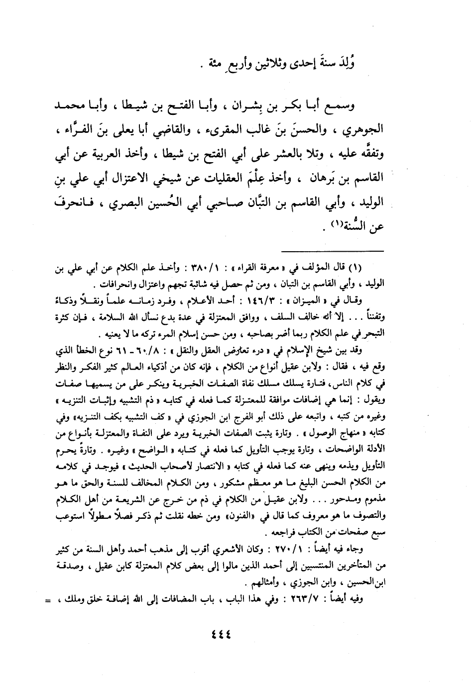(1) قال المؤلف في " معرفة القراء ": 1 / 380: وأخذ علم الكلام عن أبي علي بن الوليد، وأبي القاسم بن التبان، ومن ثم حصل فيه شائبة تجهم واعتزال وانحرافات.