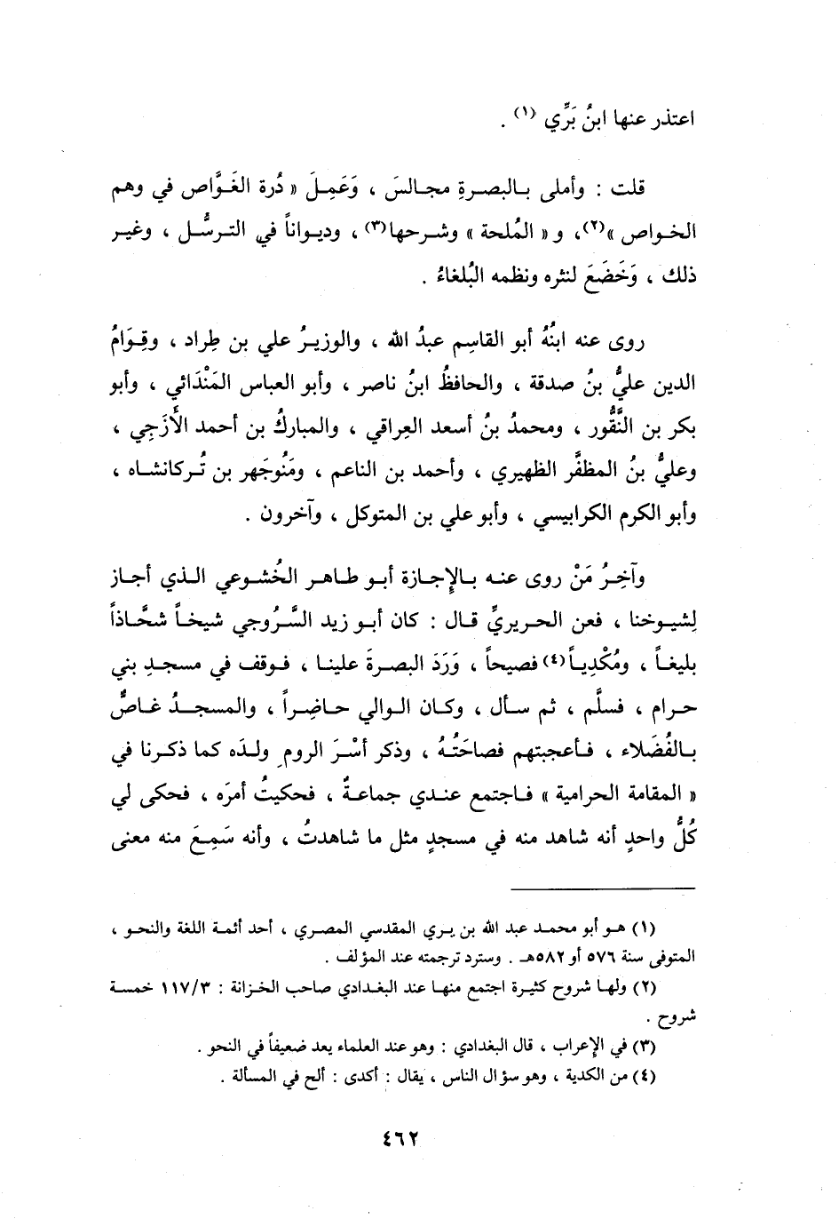 وَآخِرُ مَنْ رَوَى عَنْهُ بِالإِجَازَةِ: أَبُو طَاهِرٍ الخُشُوْعِيّ الَّذِي أَجَازَ لِشُيُوْخنَا، فَعن الحَرِيْرِيِّ قَالَ: كَانَ أَبُو زَيْد السَّرُوجِي شَيْخاً شَحَّاذاً بَلِيْغاً، وَمُكْدِياً (4) فَصِيْحاً، وَرَدَ البَصْرَةَ عَلَيْنَا، فَوَقَفَ فِي مَسْجِدِ بَنِي حَرَام، فَسَلَّمَ، ثُمَّ سَأَلَ، وَكَانَ الوَالِي حَاضِراً، وَالمَسْجَدُ غَاصٌّ بِالفُضَلاَء، فَأَعْجَبتهُم فَصَاحَتُهُ، وَذَكَرَ أَسْرَ الرُّوْم وَلدَه كَمَا ذكرنَا فِي (المقَامَة الحرَامِيَة) فَاجتمع عِنْدِي جَمَاعَةٌ، فَحكيتُ أَمرَه، فَحكَى لِي كُلُّ وَاحِدٍ أَنَّهُ شَاهَدَ مِنْهُ فِي مَسْجِدٍ مِثْل مَا شَاهدتُ، وَأَنَّهُ سَمِعَ مِنْهُ مَعْنَى