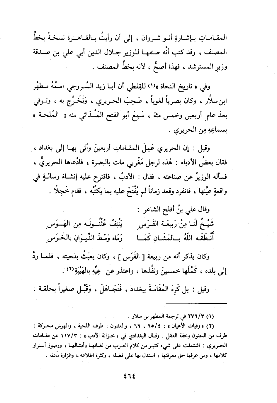وَفِي (تَارِيخ النُّحَاةِ (1)) لِلْقِفطِيِّ: أَنَّ أَبَا زَيْدٍ السَّروجِي اسْمُهُ مُطهَّر بن سلاَّر، وَكَانَ بَصْرِيّاً لغوياً، صَحِبَ الحَرِيْرِيّ، وَتَخَرَّج بِهِ، وَتُوُفِّيَ بَعْد عَامِ أَرْبَعِيْنَ وَخَمْسِ مائَةٍ، سَمِعَ أَبُو الفَتْحِ المَنْدَائِيُّ مِنْهُ (المُلحَة) بِسمَاعه مِنَ الحَرِيْرِيّ.