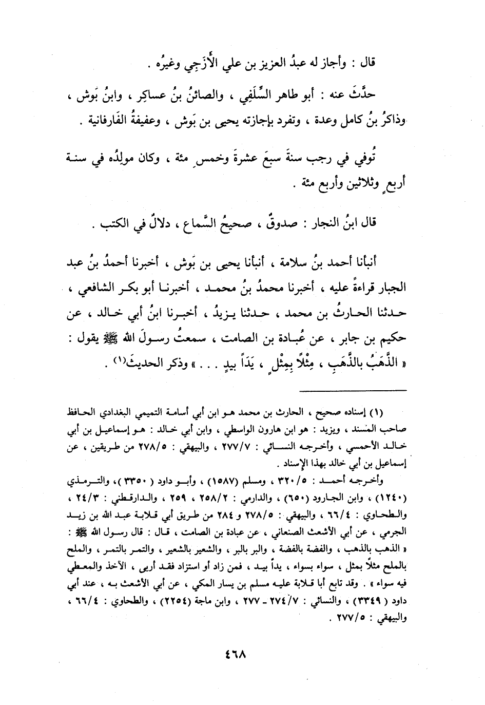 أَنْبَأَنَا أَحْمَدُ بنُ سَلاَمَةَ، أَنْبَأَنَا يَحْيَى بنُ بَوش، أَخْبَرَنَا أَحْمَدُ بنُ عَبْدِ الجَبَّارِ قِرَاءةً عَلَيْهِ، أَخْبَرَنَا مُحَمَّدُ بنُ مُحَمَّدٍ، أَخْبَرَنَا أَبُو بَكْرٍ الشَّافِعِيُّ، حَدَّثَنَا الحَارِثُ بنُ مُحَمَّدٍ، حَدَّثَنَا يَزِيْدُ، أَخْبَرْنَا ابْنُ أَبِي خَالِدٍ، عَنْ حَكِيْمٍ بنِ جَابِرٍ، عَنْ عُبَادَةَ بنِ الصَّامِتِ: