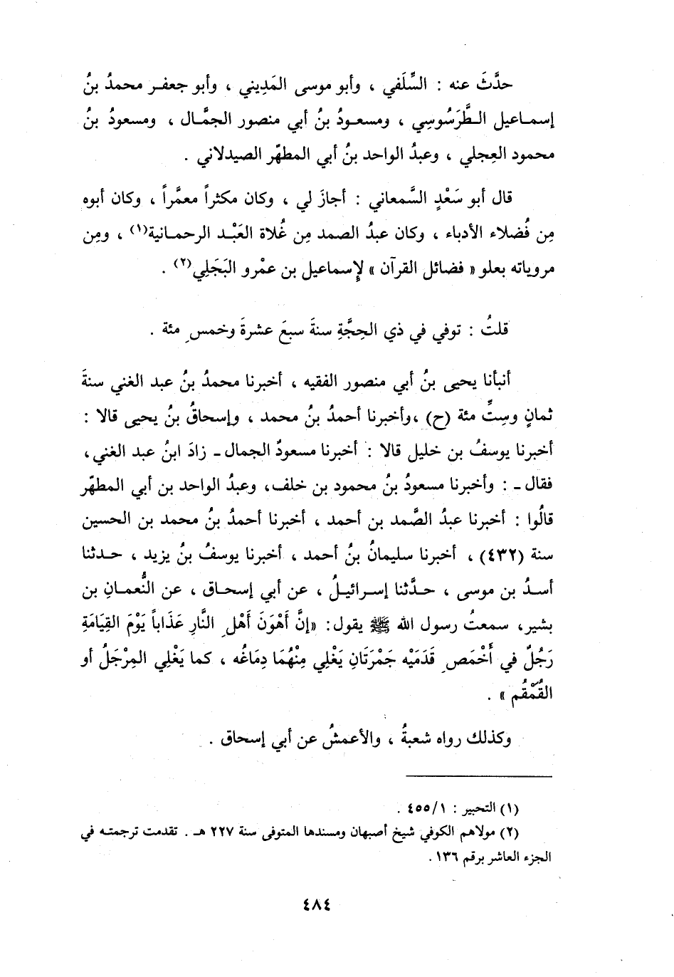 أَخْبَرَنَا عبدُ الصَّمد بن أَحْمَدَ، أَخْبَرَنَا أَحْمَدُ بنُ مُحَمَّدِ بنِ الحُسَيْنِ سَنَة (432) ، أَخْبَرَنَا سُلَيْمَانُ بنُ أَحْمَدَ، أَخْبَرَنَا يُوْسُفُ بنُ يَزِيْدَ، حَدَّثَنَا أَسَدُ بنُ مُوْسَى، حَدَّثَنَا إِسْرَائِيْلُ، عَنْ أَبِي إِسْحَاقَ، عَنِ النُّعْمَانِ بن بَشِيْرٍ: