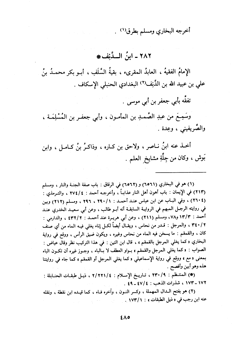 (2) هو بفتح الدال المهملة، وكسر النون، وآخره فاء، كما قيده ابن نقطة، ونقله عنه ابن رجب في " ذيل الطبقات ": 1 / 173.