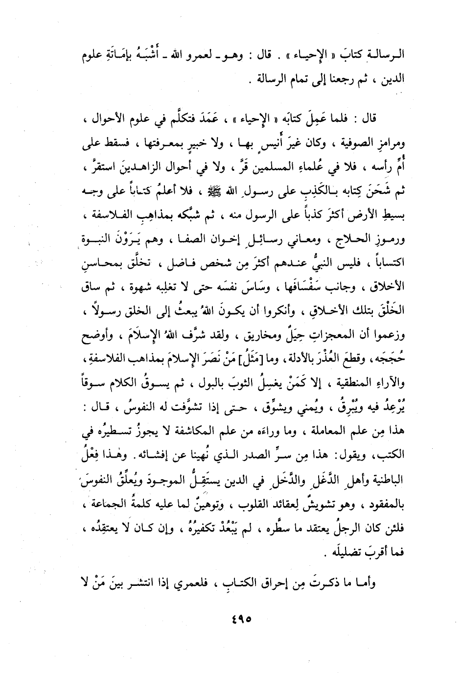 قَالَ: وَهُوَ - لَعَمْرُو الله - أَشْبَهُ بِإِمَاتَةِ عُلُوْم الدّين، ثُمَّ رَجَعنَا إِلَى تَمَام الرِّسَالَة.