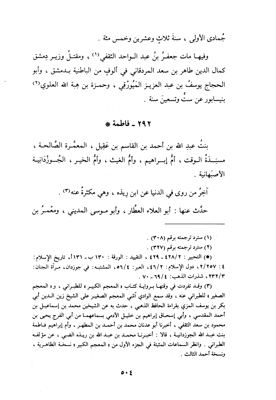 292 - فَاطِمَةُ بِنْتُ عَبْدِ اللهِ بنِ أَحْمَدَ بنِ القَاسِمِ بنِ عَقِيْلٍ *