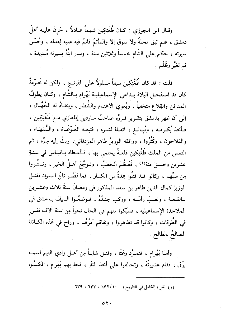 قُلْتُ: قَدْ كَانَ طُغْتِكِين سَيْفاً مسلَوْلاً عَلَى الفِرَنْج، وَلَكِن لَهُ خَرْمَةٌ كَانَ قَدِ اسْتفحل البَلاَءُ بدَاعِي الإِسْمَاعِيْليَّة بَهْرَامَ بِالشَّامِ، وَكَانَ يَطُوْفُ المَدَائِن وَالقِلاع متخفِياً، وَيُغوِي الأَغتَام وَالشُّطَار، وَيَنْقَادُ لَهُ الجُهَّال، إِلَى أَنْ ظَهَرَ بِدِمَشْقَ بتقرِير قرَّره صَاحِبُ مَاردين إِيلغَازِي مَعَ طُغْتِكِين، فَأَخَذَ يُكرمه، وَيُبَالغ اتِّقَاءً لِشرِّه، فَتبعه الغَوْغَاءُ، وَالسُّفَهَاء، وَالفلاَحُوْنَ، وَكَثُرُوا، وَوَافقه الوَزِيْرُ طَاهِر المزدقَانِي، وَبثَّ إِلَيْهِ سِرَّه، ثُمَّ الْتمس مِنَ الْملك طُغْتِكِين قَلْعَةً يَحتمِي بِهَا، فَأَعْطَاهُ بَانِيَاس فِي سَنَةِ عِشْرِيْنَ وَخَمْسِ مائَةٍ (1) ، فَعَظُمَ الخطبُ، وَتَوَجَّعَ أَهْلُ الخَيْر، وَتَسَتَّرُوا مِنْ سَبِّهِم، وَكَانُوا قَدْ قتلُوا عِدَّةً مِنَ الكِبَارِ، فَمَا قَصَّر تَاجُ المُلُوْك فَقتل الوَزِيْرَ كَمَالَ الدّين طَاهِر بن سَعْدٍ المَذْكُور فِي رَمَضَانَ، سَنَةَ ثَلاَثٍ وَعِشْرِيْنَ بِالقَلْعَة، وَنصبَ رَأْسَه، وَركب جندُهُ، فَوضعُوا السَّيْفَ بِدِمَشْقَ فِي الملاَحدَة الإِسْمَاعِيْليَّة، فَسبَّكُوا مِنْهُم فِي الحَال نَحْواً مِنْ سِتَّة آلاَف نَفْسٍ فِي الطُّرقَات، وَكَانُوا قَدْ تَظَاهِرُوا، وَتَفَاقم أَمرُهُم، وَرَاح فِي هَذِهِ الكَائِنَة الصَّالِحُ بِالطَّالح.
