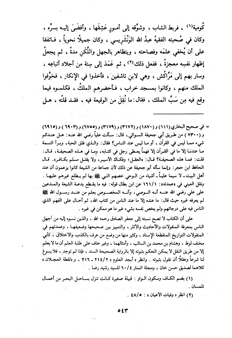 على أن الكتاب لا تصح نسبته إلى جعفر الصادق رحمه الله، والذين نسبوه إليه من أجهل الناس بمعرفة المنقولات والأحاديث والآثار، والتمييز بين صحيحها وضعيفها، وعمدتهم في المنقولات التواريخ المنقطعة الإسناد، وكثير منها من وضع من عرف بالكذب والاختلاق، كأبي مخنف لوط، وهشام بن محمد بن السائب، وأمثالهما، وغير خاف على طلبة العلم أن ما لا يعلم إلا من طريق النقل لا يمكن الحكم بثبوته إلا بالرواية الصحيحة السند، فإذا لم توجد، فلا يسوغ لنا شرعا وعقلا أن نقول بثبوته، وانظر " أبجد العلوم " 2 / 214 - 216، و" لقطة العجلان " كلاهما لصديق حسن خان، ومجلة المنار 4 / 60 للسيد رشيد رضا.