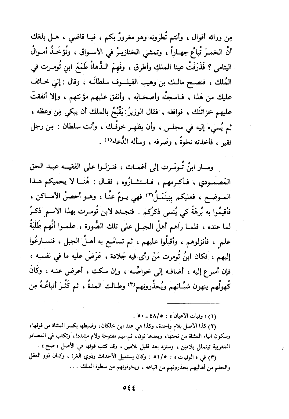 (2) كذا الأصل بلام واحدة، وكذا هي عند ابن خلكان، وضبطها بكسر المثناة من فوقها، وسكون الياء المثناة من تحتها، وبعدها نون، ثم ميم مفتوحة ولام مشددة، وتكتب في المصادر المغربية تينملل بلامين، وسترد بعد قليل بلامين، وقد كتب فوقها في الأصل " صح ".