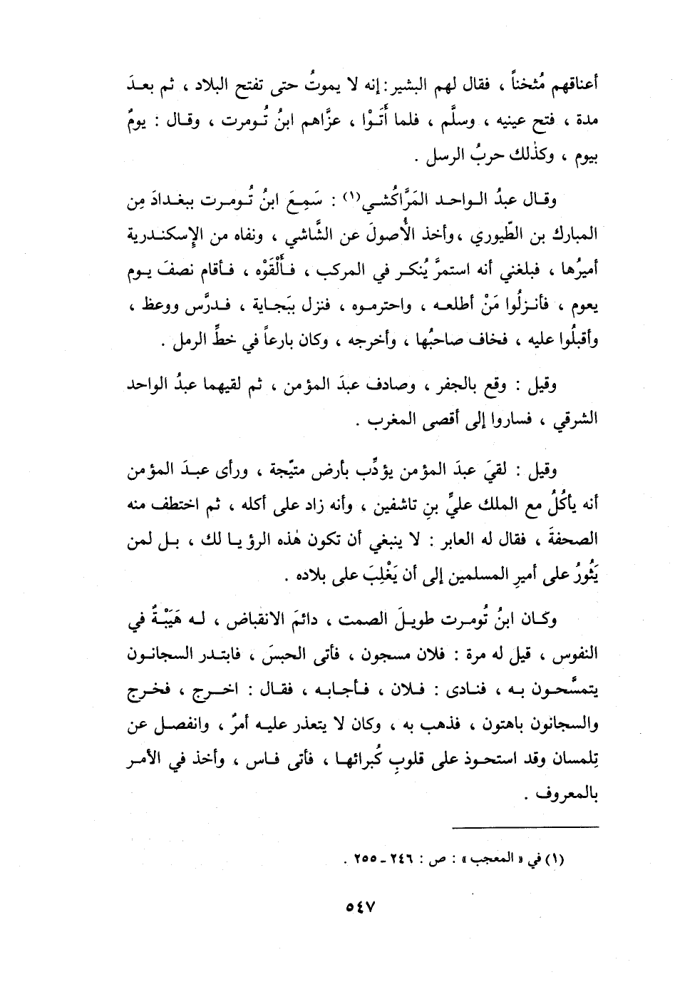 ثُمَّ بَعْدَ مُدَّة، فَتح عينِيه، وَسلَّم، فَلَمَّا أَتَوْا، عَزَّاهُم ابْن تُوْمرت، وَقَالَ: يَوْمٌ بِيَوْمٍ، وَكَذَلِكَ حربُ الرُّسل.