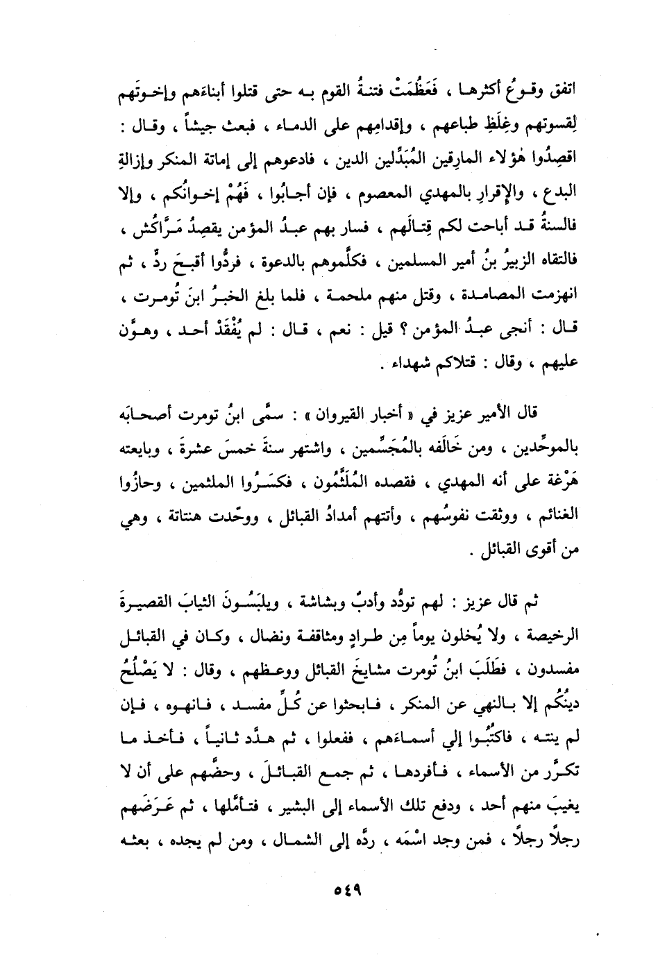 ثُمَّ قَالَ عزِيز: لَهُم تَودُّد وَأَدبٌ وَبشَاشَة، وَيلبَسُوْنَ الثِّيَاب القصِيْرَةَ الرّخيصَة، وَلاَ يُخلوْنَ يَوْماً مِنْ طِرَادٍ وَمثَاقفَة وَنضَال، وَكَانَ فِي القبَائِل مفسدُوْنَ، فَطَلَبَ ابْنُ تُوْمرت مَشَايِخَ القبَائِل وَوعظهُم، وَقَالَ: لاَ يَصْلُحُ دينُكُم إِلاَّ بِالنَّهْيِ عَنِ المُنْكَر، فَابحثُوا عَنْ كُلِّ مُفسد، فَانهوهُ، فَإِنْ لَمْ يَنْتَهِ، فَاكتُبُوا إِلَيَّ أَسْمَاءهُم، فَفَعلُوا، ثُمَّ هدَّد ثَانِياً، فَأَخَذَ مَا تَكرَّر مِنَ الأَسْمَاء، فَأَفردهَا، ثُمَّ جمع القبَائِلَ، وَحضَّهُم عَلَى أَنْ لاَ يغِيبَ مِنْهُم أَحَد، وَدفعَ تِلْكَ الأَسْمَاء إِلَى البَشِيْر، فَتَأَمَّلهَا، ثُمَّ عَرَضَهُم رَجُلاً رَجُلاً، فَمَنْ وَجد اسْمَه، رَدَّهُ إِلَى الشِّمَال، وَمَنْ لَمْ يَجده، بعثَه