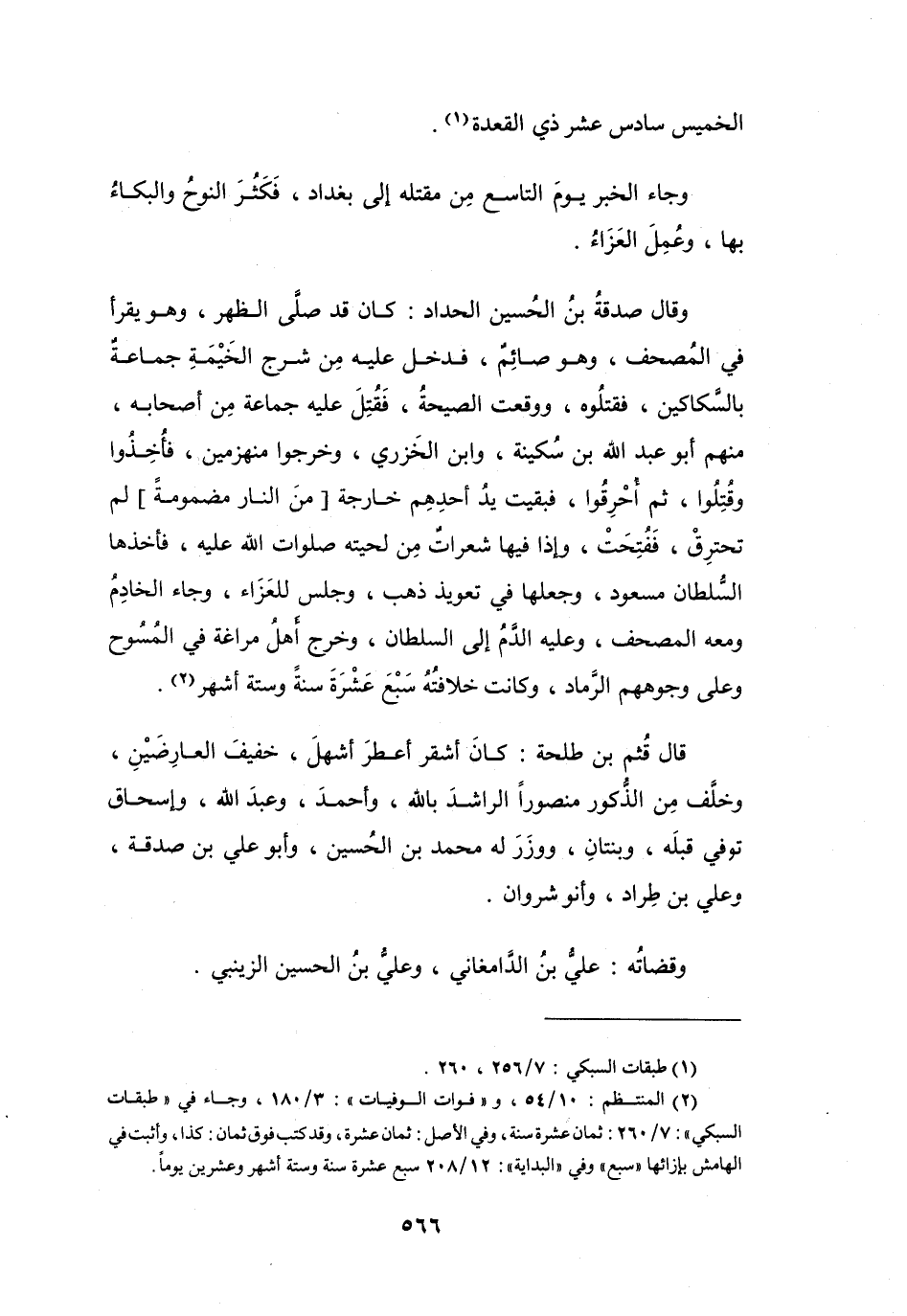 وَقَالَ صَدَقَةُ بنُ الحُسَيْنِ الحَدَّاد: كَانَ قَدْ صَلَّى الظُّهْر، وَهُوَ يَقرَأ فِي المُصْحَف، وَهُوَ صَائِمٌ، فَدَخَلَ عَلَيْهِ مِنْ شَرْجِ الخَيْمَةِ جَمَاعَةٌ بِالسَّكَاكين، فَقتلُوْهُ، وَوقعت الصيحَةُ، فَقُتِلَ عَلَيْهِ جَمَاعَةٌ مِنْ أَصْحَابِهِ، مِنْهُم: أَبُو عَبْدِ اللهِ بنُ سُكَيْنَة، وَابْن الخَزرِي، وَخرجُوا مُنْهَزِمِين، فَأُخِذُوا وَقُتِلُوا ثُمَّ أُحْرِقُوا، فَبقيت يَدُ أَحَدِهِم خَارِجَة مِنَ النَّارِ مَضْمُوْمَةً لَمْ تَحْترِقْ، فَفُتِحَتْ، وَإِذَا فِيْهَا شعرَاتٌ مِنْ لِحْيَتِهِ - صَلَوَاتُ اللهُ عَلَيْهِ - فَأَخَذَهَا السُّلْطَان مَسْعُوْد، وَجَعَلهَا فِي تَعويذ ذهب، وَجَلَسَ لِلْعَزَاء، وَجَاءَ الخَادِمُ وَمَعَهُ المُصْحَف، وَعَلَيْهِ الدَّمُ إِلَى السُّلْطَان، وَخَرَجَ أَهْلُ مرَاغَة فِي المُسُوح وَعَلَى وُجُوْهِهِم الرَّمَاد، وَكَانَتْ خِلاَفَتُهُ سَبْعَ عَشْرَةَ سَنَةً وَسِتَّة أَشْهُرٍ (2) .