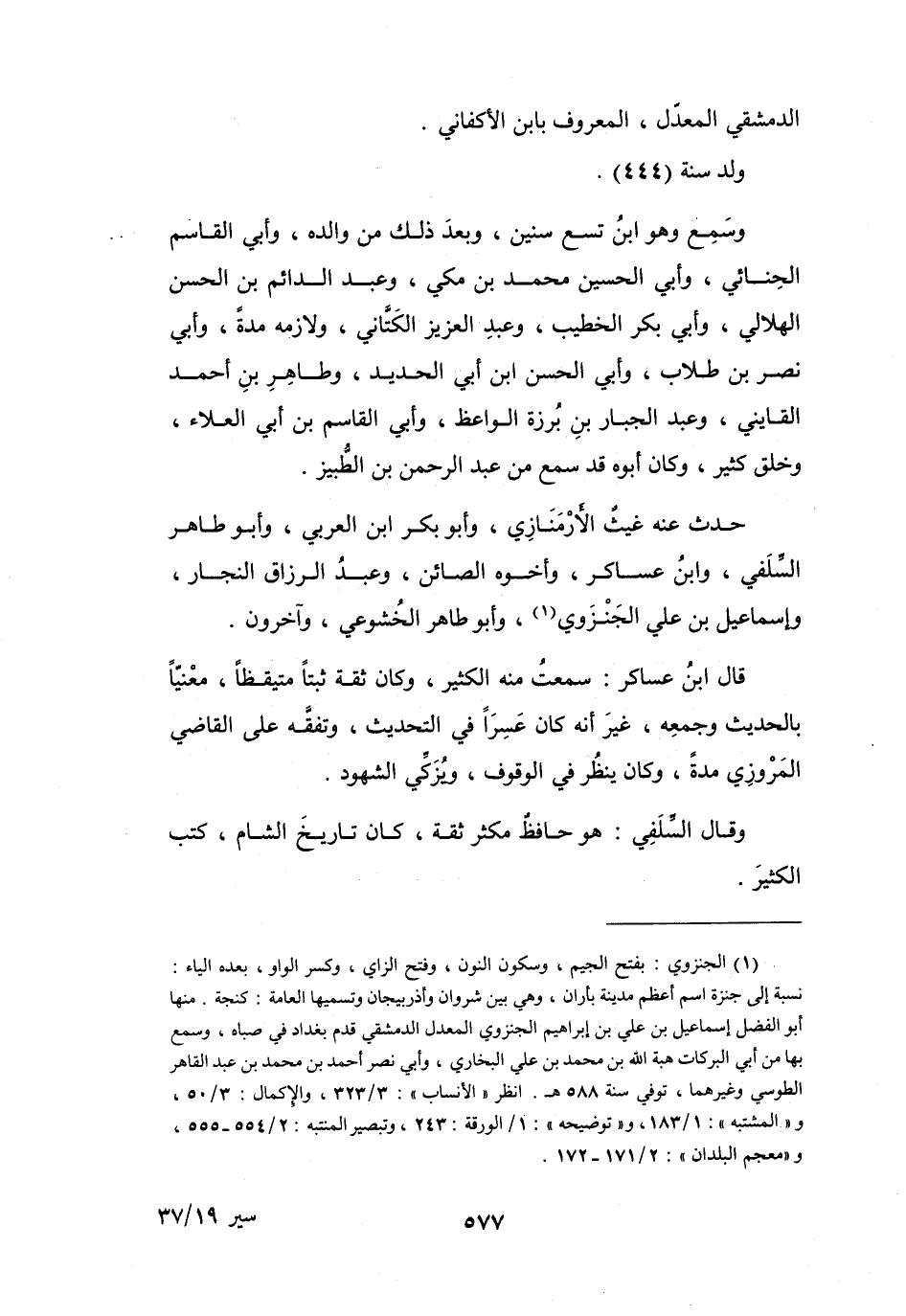 منها أبو الفضل إسماعيل بن علي بن إبراهيم الجنزوي المعدل الدمشقي قدم بغداد في صباه، وسمع بها من أبي البركات هبة الله بن محمد بن علي البخاري، وأبي نصر أحمد بن محمد بن عبد القاهر الطوسي وغيرهما، توفي سنة 588 هـ.