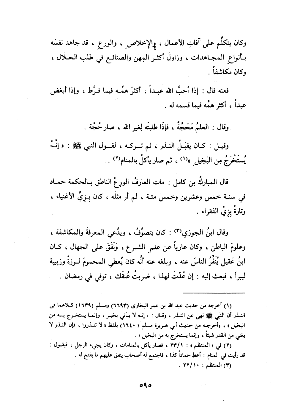 وَقَالَ ابْنُ الجَوْزِيِّ (3) :كَانَ يَتصَوَّفُ، وَيَدَّعِي المَعْرِفَة وَالمكَاشفَة، وَعُلُوْمَ البَاطِن، وَكَانَ عَارِياً عَنْ علمِ الشَّرع، وَنَفَقَ عَلَى الجهَال، كَانَ ابْنُ عَقِيْلٍ يُنَفِّرُ النَّاسَ عَنْهُ، وَبَلَغَهُ عَنْهُ أَنَّهُ كَانَ يُعطِي المَحمُومَ لَوْزَةً وَزبِيْبَة ليبرَأَ، فَبَعَثَ إِلَيْهِ: إِنْ عُدْتَ لِهَذَا ضربتُ عُنُقَك، تُوُفِّيَ فِي رَمَضَانَ.