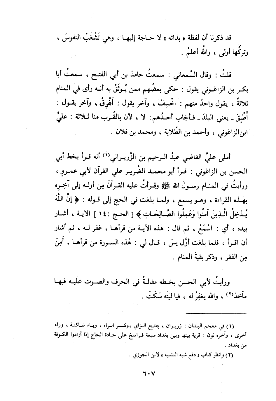 أَملَى عليَّ القَاضِي عَبْدُ الرَّحِيْمِ بن الزَّرِيْرَانِي (1) أَنَّهُ قرَأَ بِخَطِّ أَبِي الحَسَنِ بنِ الزَّاغونِي: قرَأَ أَبُو مُحَمَّدٍ الضّرِير عليَّ القُرْآن لأَبِي عَمْرٍو، وَرَأَيْتُ فِي المَنَامِ رَسُوْلَ اللهِ - صَلَّى اللَّهُ عَلَيْهِ وَسَلَّمَ - وَقَرَأْتُ عَلَيْهِ القُرْآن مِنْ أَوَّلِهِ إِلَى آخِرِهِ بِهَذِهِ القِرَاءة، وَهُوَ يَسْمَع، وَلَمَّا بلغت فِي الحَجّ إِلَى قَوْلِهِ: {إِنَّ اللهَ يُدْخِلُ الَّذِيْنَ آمَنُوا وَعَمِلُوا الصَّالِحَاتِ} [الحَجّ:14] الآيَة، أَشَارَ بِيَدِهِ، أَي: اسْمَعْ، ثُمَّ قَالَ: هَذِهِ الآيَة مَنْ قرَأَهَا، غُفِرَ لَهُ، ثُمَّ أَشَارَ أَن اقرَأْ، فَلَمَّا بلغتُ أَوّل يَس، قَالَ لِي: هَذِهِ السُّورَة مَنْ قرَأَهَا، أَمِنَ مِنَ الفَقْر، وَذَكَرَ بَقِيَّةَ المَنَام.