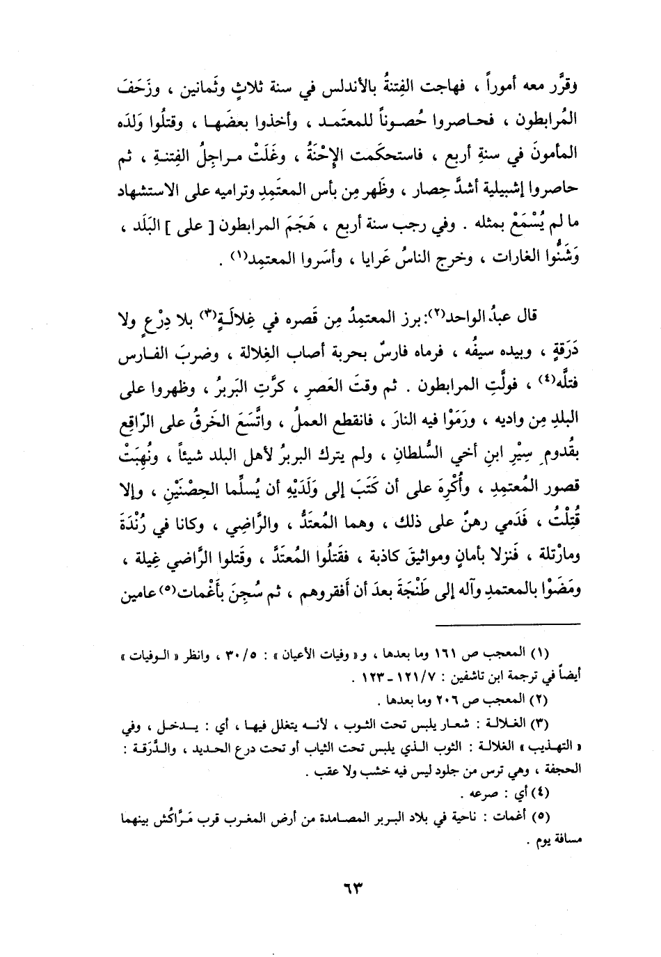 قَالَ عبدُ الوَاحِد (2) :برز المعتمِدُ مِنْ قَصْره فِي غِلاَلَةٍ (3) بِلاَ دِرْعٍ وَلاَ دَرَقَةٍ، وَبِيَدِهِ سَيْفُه، فَرمَاهُ فَارِسٌ بِحربَة أَصَاب الغِلاَلَة، وَضربَ الفَارِس فَتَلَّه (4) ، فَولَّتِ المرَابطون.