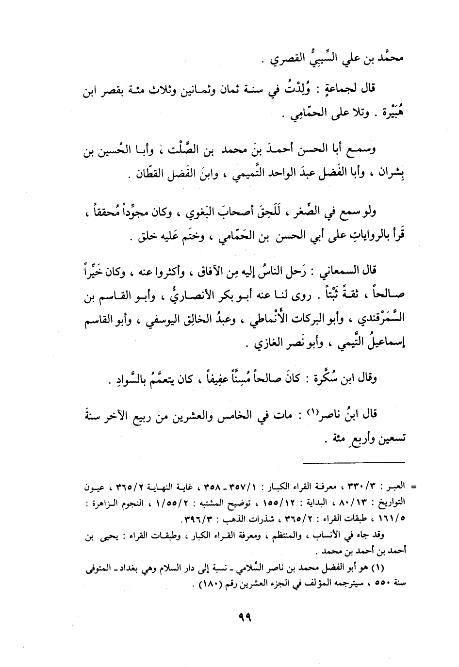 (1) هو أبو الفضل محمد بن ناصر السلامي - نسبة إلى دار السلام وهي بغداد - المتوفي سنة 550، سيترجمه المؤلف في الجزء العشرين رقم (180) .