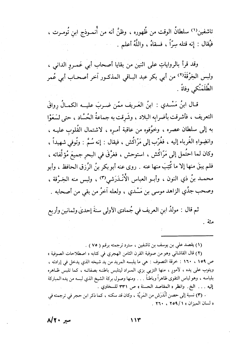 تَاشفِيْنَ (1) سُلْطَانُ الوَقْتِ مِنْ ظُهُوْرِه، وَظَنَّ أَنَّهُ مِنْ أُنْمُوْذَجِ ابْنِ تُوْمَرْتَ، فَيُقَالُ: إِنَّهُ قَتلَه سِرّاً، فَسقَاهُ - وَاللهُ أَعْلَمُ -.