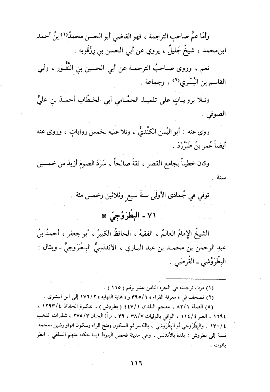 (*) الصلة 1 / 82، معجم البلدان 1 / 447 (بطروش) ، تذكرة الحفاظ 4 / 1293، 1294، العبر 4 / 114، الوافي بالوفيات 7 / 38، 39، مرآة الجنان 3 / 275، شذرات الذهب 4 / 130.