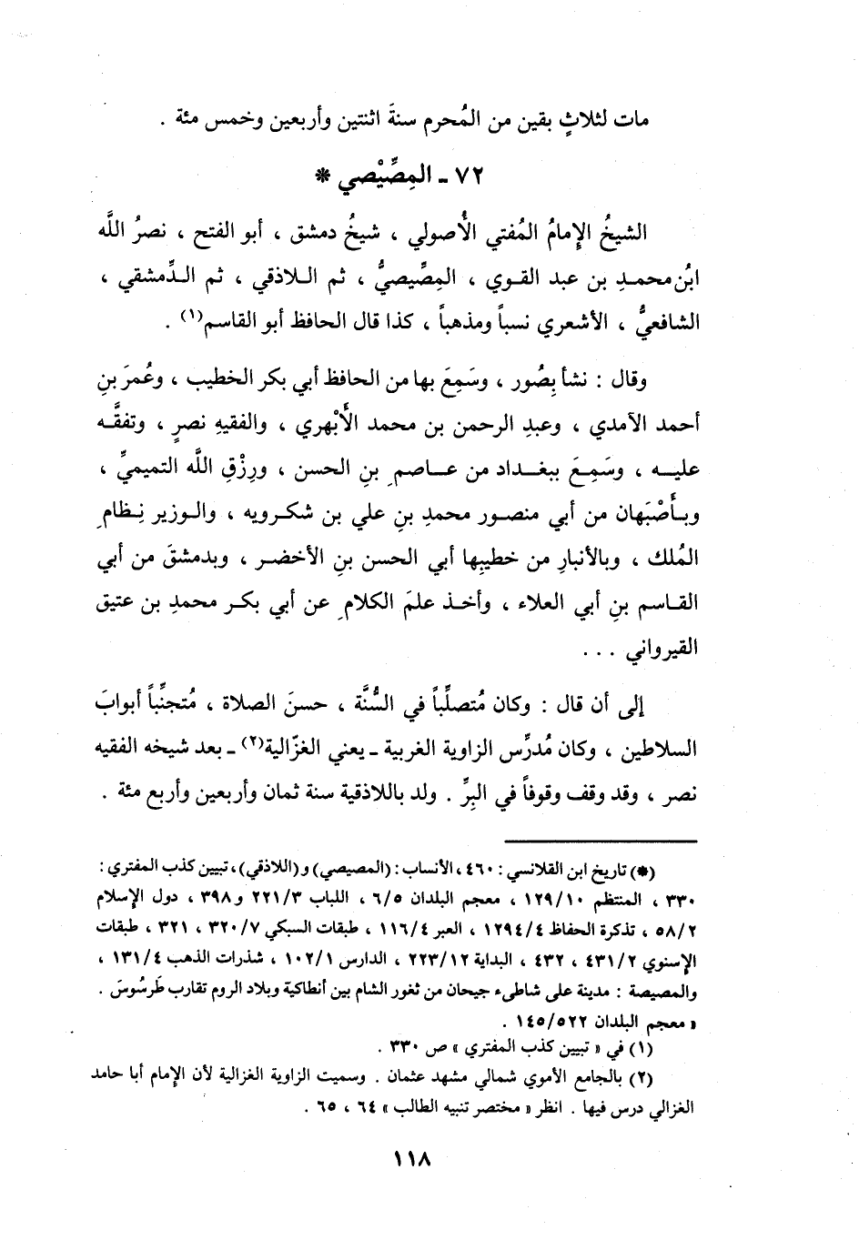 الاسنوي 2 / 431، 432، البداية 12 / 223، الدارس 1 / 102، شذرات الذهب 4 / 131، والمصيصة: مدينة على شاطئ جيحان من ثغور الشام بين أنطاكية وبلاد الروم تقارب طرسوس. " معجم البلدان 522 / 145.