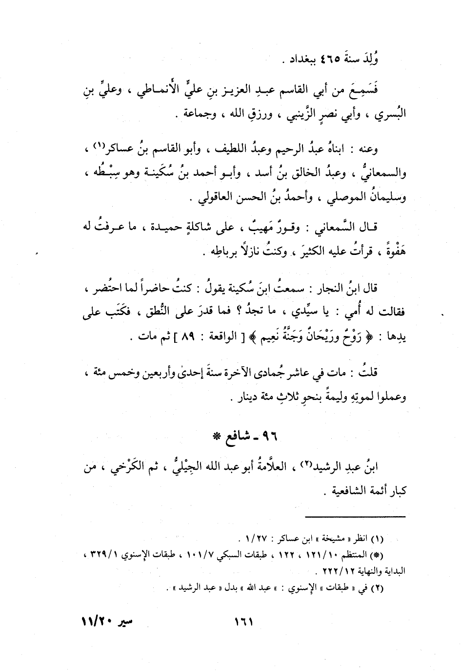(*) المنتظم 10 / 121، 122، طبقات السبكي 7 / 101، طبقات الاسنوي 1 / 329، البداية والنهاية 12 / 222.