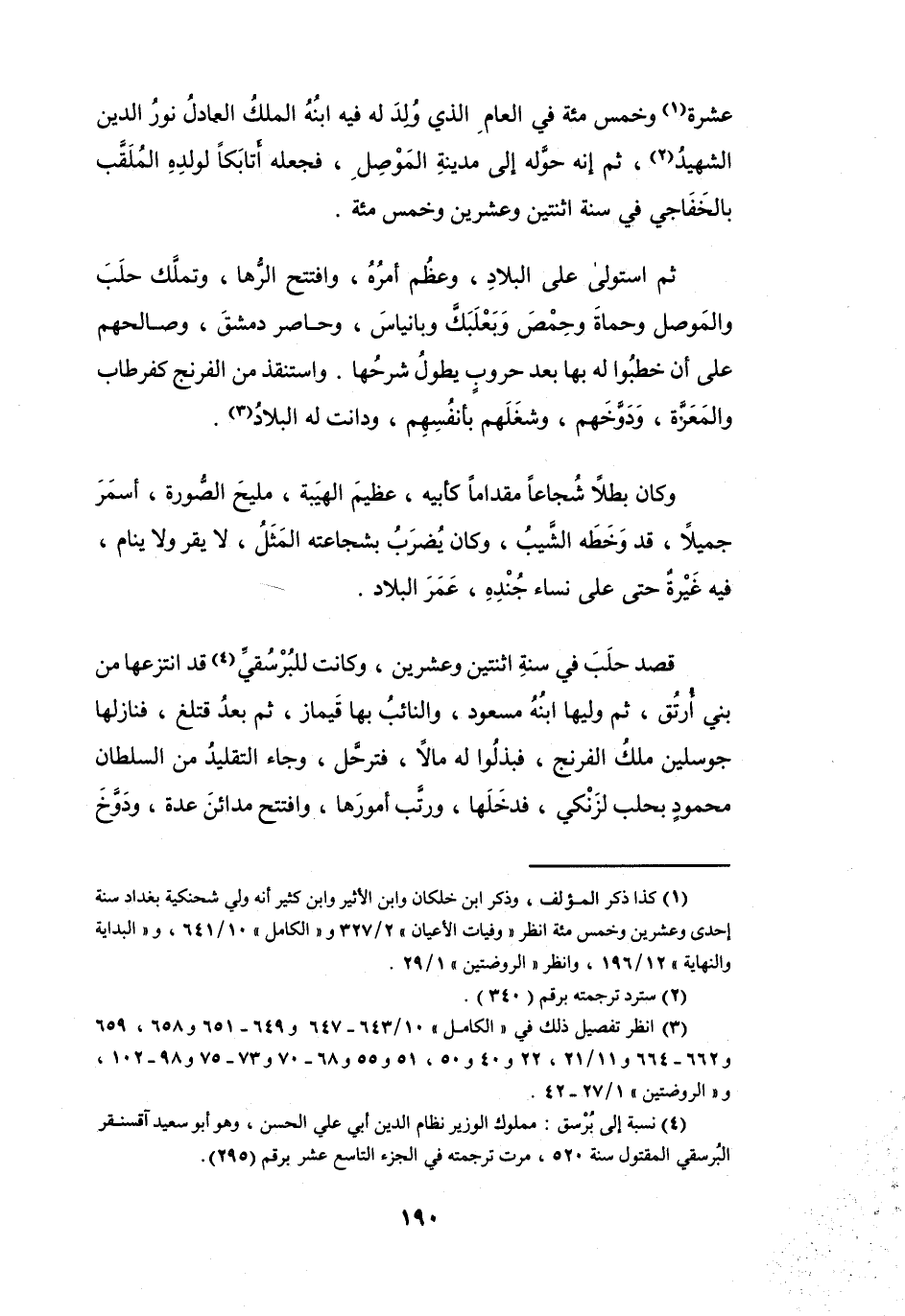 (1) كذا ذكر المؤلف، وذكر ابن خلكان وابن الأثير وابن كثير أنه ولي شحنكية بغداد سنة إحدى وعشرين وخمس مئة انظر " وفيات الأعيان " 2 / 327 و" الكامل " 10 / 641، و" البداية والنهاية " 12 / 196، وانظر " الروضتين " 1 / 29.