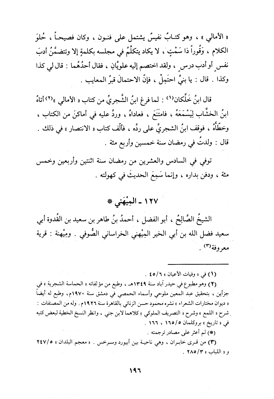 (2) وهو مطبوع في حيدر آباد سنة 1349 هـ، وطبع من مؤلفاته " الحماسة الشجرية " في جزأين، بتحقيق عبد المعين ملوحي وأسماء الحمصي في دمشق سنة 1970 م، وطبع له أيضا " ديوان مختارات الشعراء " نشره محمود حسن الزناتي بالقاهرة سنة 1926 م.
