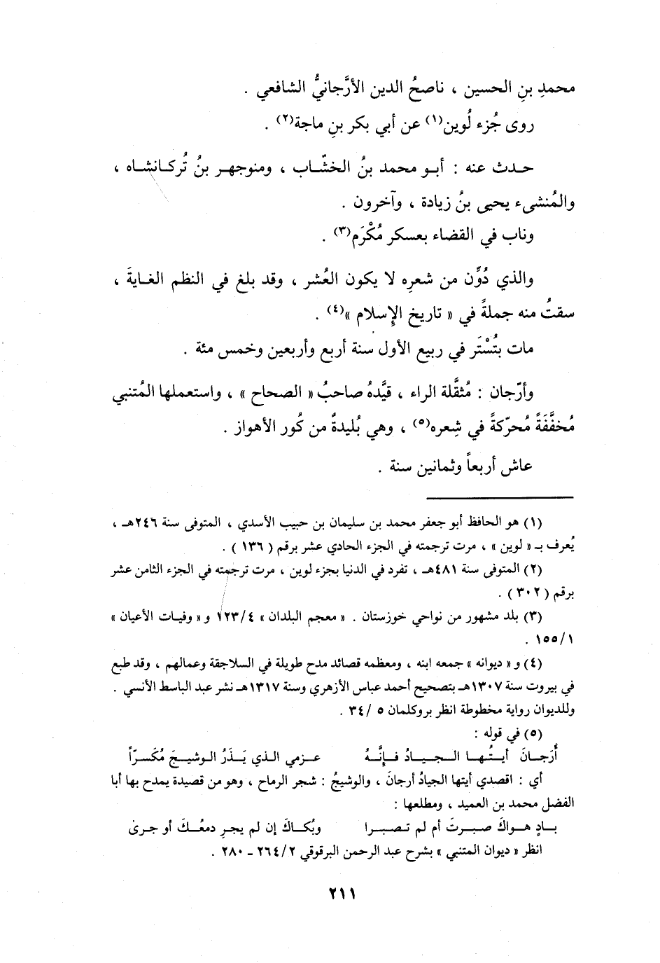 (5) في قوله: أرجان أيتها الجياد فإنه * عزمي الذي يذر الوشيج مكسرا أي: اقصدي أيتها الجياد أرجان، والوشيج: شجر الرماح، وهو من قصيدة يمدح بها أبا الفضل محمد بن العميد، ومطلعها: باد هواك صبرت أم لم تصبرا * وبكاك إن لم يجر دمعك أو جرى انظر " ديوان المتنبي " بشرح عبد الرحمن البرقوقي 2 / 264 - 280.