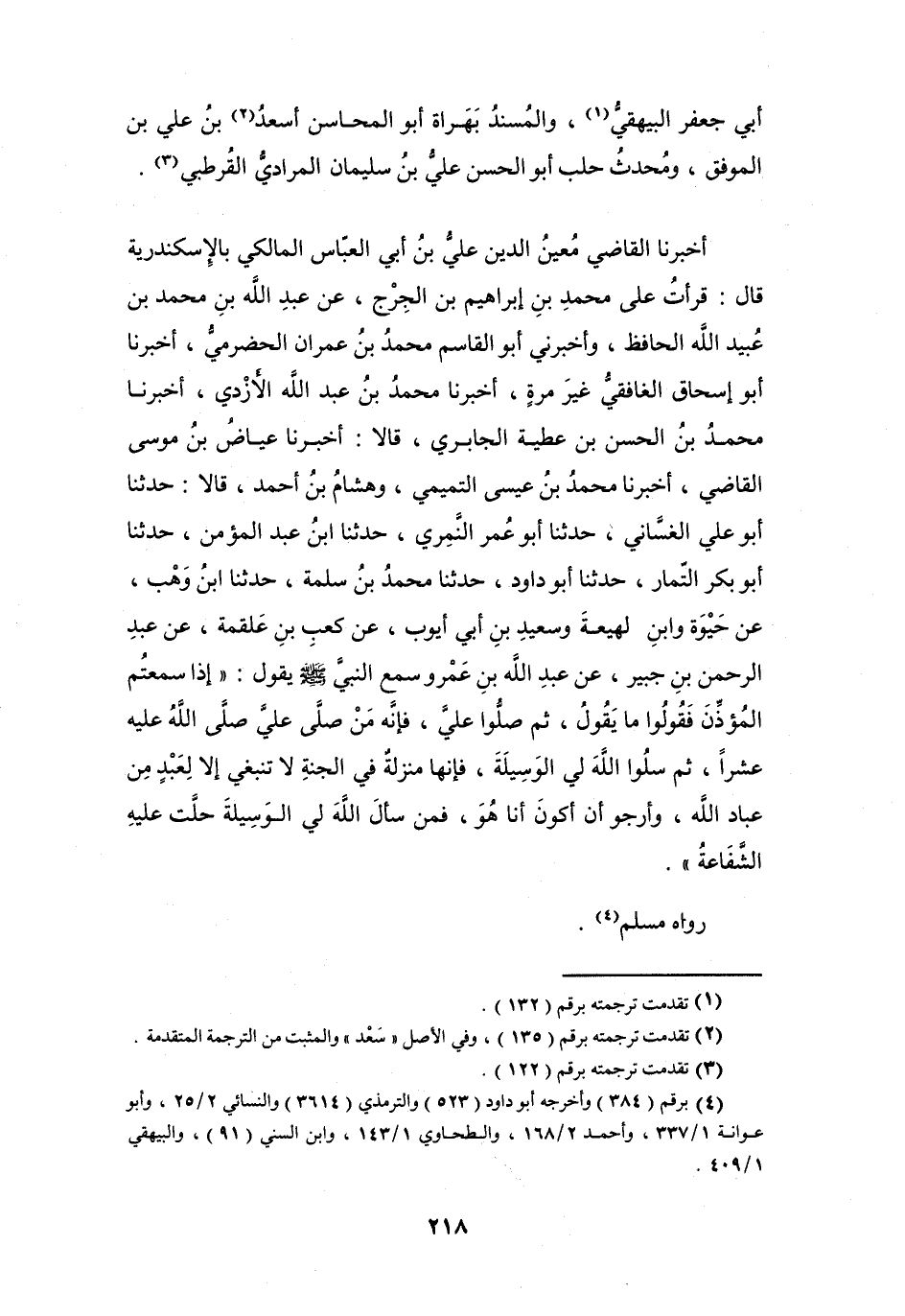 أَبِي جَعْفَرٍ البَيْهَقِيّ (1) ، وَالمُسْنِدُ بِهَرَاةَ أَبُو المَحَاسِنِ أَسَعْد (2) بن عَلِيِّ بنِ المُوَفَّق، وَمُحَدِّث حلب أَبُو الحَسَنِ عَلِيُّ بنُ سُلَيْمَانَ المُرَادِيّ القُرْطُبِيّ (3) .