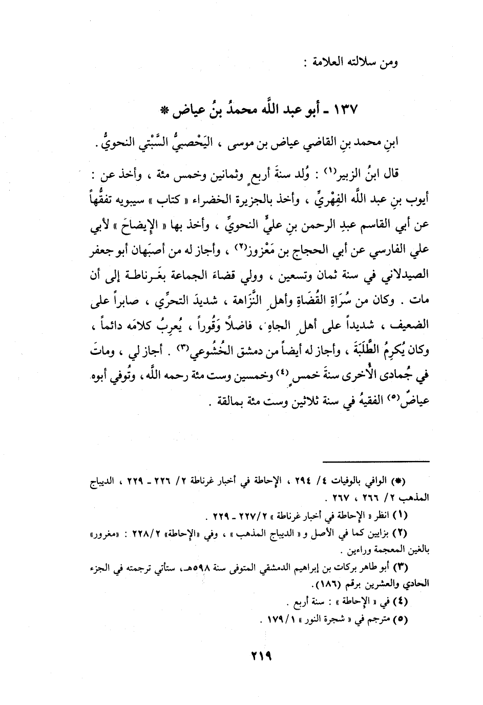 أَجَازَ لِي، وَمَاتَ فِي جُمَادَى الأُخْرَى، سَنَة خَمْسٍ (4) وَخَمْسِيْنَ وَسِتِّ مائَةٍ -رَحِمَهُ اللهُ- وَتُوُفِّيَ أَبُوْهُ عيَاض (5) الفَقِيْه فِي سَنَةِ ثَلاَثِيْنَ وَسِتِّ مائَةٍ، بِمَالَقَة.