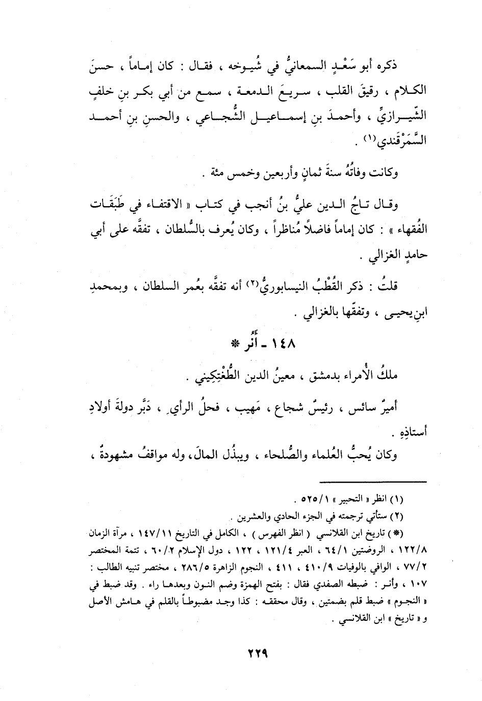 (*) تاريخ ابن القلانسي (انظر الفهرس) ، الكامل في التاريخ 11 / 147، مرآة الزمان 8 / 122، الروضتين 1 / 64، العبر 4 / 121، 122، دول الإسلام 2 / 60، تتمة المختصر 2 / 77، الوافي بالوفيات 9 / 410، 411، النجوم الزاهرة 5 / 286، مختصر تنبيه الطالب: 107، وأنر: ضبطه الصفدي فقال: بفتح الهمزة وضم النون وبعدها راء.