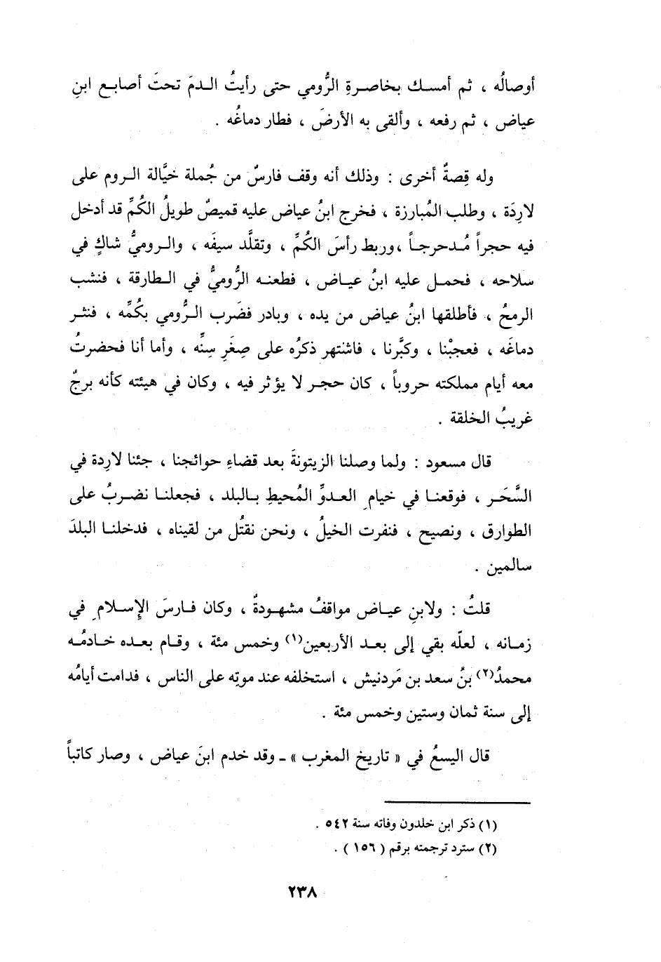 قُلْتُ: وَلابْنِ عيَاضٍ مَوَاقِفُ مَشْهُوْدَةٌ، وَكَانَ فَارِسَ الإِسْلاَمِ فِي زَمَانِهِ، لَعَلَّهُ بَقِيَ إِلَى بَعْدَ الأَرْبَعِيْنَ (1) وَخَمْسِ مائَةٍ، وَقَامَ بَعْدَهُ خَادمُهُ مُحَمَّدُ (2) بنُ سَعْدِ بنِ مَرْدَنِيْش، اسْتخلفَهُ عِنْدَ مَوْتِهِ عَلَى النَّاسِ، فَدَامَتْ أَيَّامُهُ إِلَى سَنَةِ ثَمَانٍ وَسِتِّيْنَ وَخَمْسِ مائَةٍ.