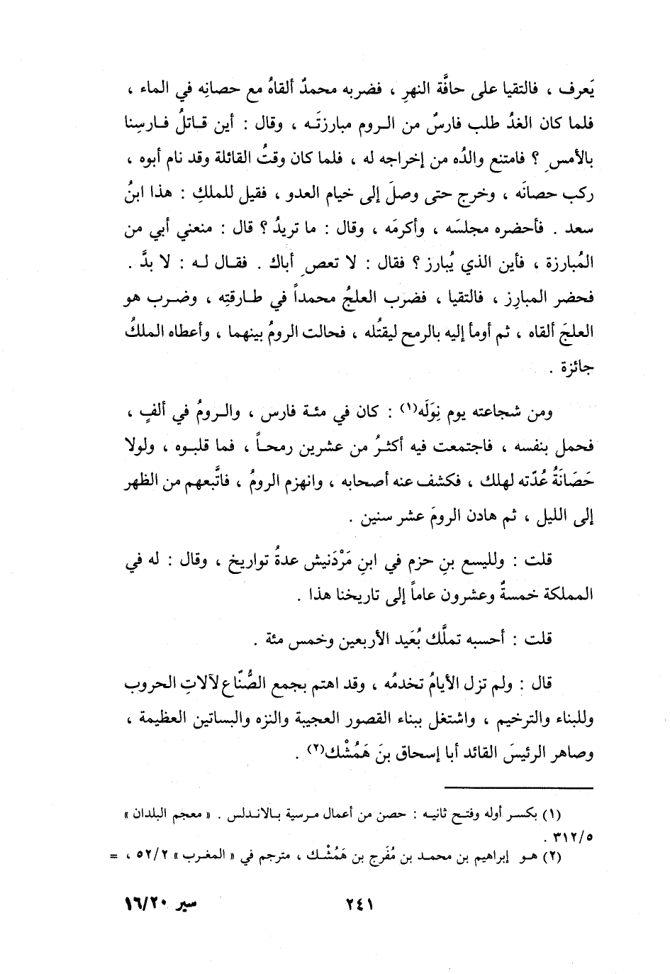 وَمِنْ شَجَاعَتِهِ يَوْمَ نِوَلَه (1) : كَانَ فِي مائَةِ فَارِسٍ، وَالرُّوْمُ فِي أَلْفٍ، فَحَمَلَ بِنَفْسِهِ، فَاجتمعَتْ فِيْهِ أَكْثَرُ مِنْ عِشْرِيْنَ رُمْحاً، فَمَا قَلَبُوهُ، وَلَوْلاَ حَصَانَةُ عُدَّتِهِ لَهَلَكَ، فَكشفَ عَنْهُ أَصْحَابُهُ، وَانْهَزَمَ الرُّوْمُ، فَاتَّبَعَهُم مِنَ الظُّهْرِ إِلَى اللَّيْلِ، ثُمَّ هَادَنَ الرُّوْمَ عشرَ سِنِيْنَ.