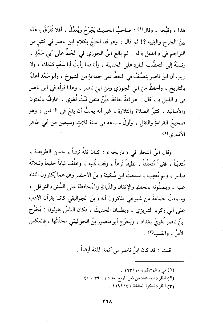 وَقَالَ ابْنُ النَّجَّارِ فِي (تَارِيْخِهِ) : كَانَ ثِقَةً، ثَبْتاً، حسنَ الطّرِيقَة، مُتَدَيِّناً، فَقِيراً، مُتَعَفِّفاً، نَظِيفاً، نَزِهاً، وَقَفَ كُتُبَهُ، وَخلَّف ثِيَاباً خَلِيعاً وَثَلاَثَةَ دَنَانِيْرَ وَلَمْ يُعقِب، سَمِعْتُ ابْنَ سُكَيْنَة وَابْن الأَخْضَرِ وَغَيْرَهُمَا يُكثرُوْنَ الثَّنَاء عَلَيْهِ، وَيَصِفُوْنَهُ بِالحِفْظ، وَالإِتْقَان، وَالدِّيَانَة، وَالمحَافِظَة عَلَى السُّنَن وَالنوَافل، وَسَمِعْتُ جَمَاعَة مِنْ شُيُوْخِي يذكرُوْنَ أَنَّهُ وَابْنَ الجَوَالِيْقِيّ كَانَا يَقْرَآن الأَدب عَلَى أَبِي زَكَرِيَّا التِّبْرِيْزِيّ، وَيطلبَان الحَدِيْث، فَكَانَ النَّاسُ يَقُوْلُوْنَ: يَخْرُج ابْن نَاصر لغوِي بَغْدَاد، وَيَخْرُج أَبُو مَنْصُوْرٍ بن الجَوَالِيْقِيّ مُحَدِّثهَا، فَانعكس الأَمْر، وَانقَلْب (3) ...