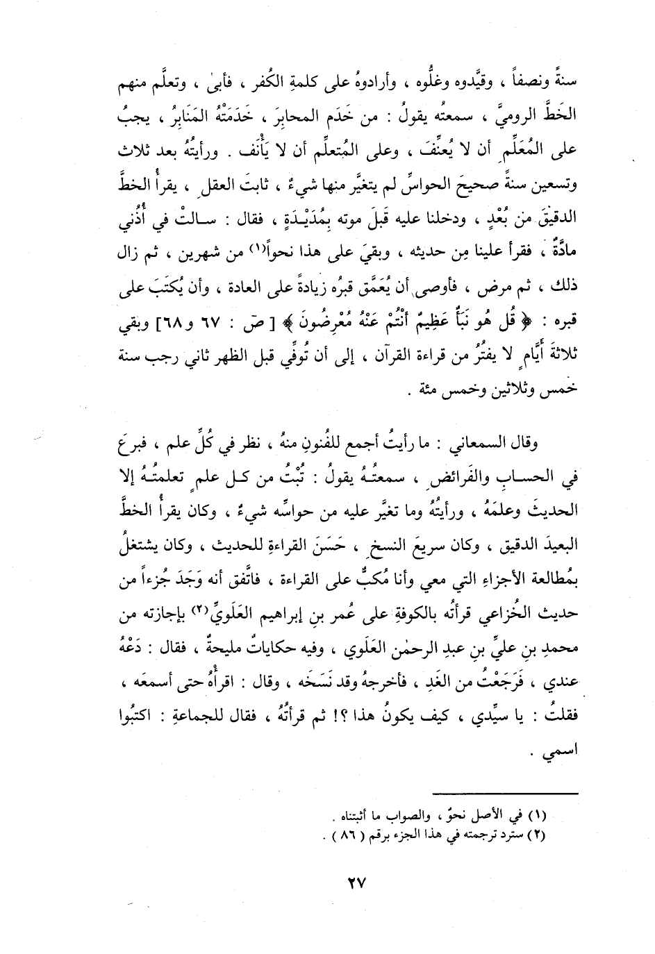 تُبتُ مِنْ كُلِّ علمٍ تَعلَّمتُهُ إِلاَّ الحَدِيْثَ وَعِلمَهُ، وَرَأَيْتهُ وَمَا تَغَيَّرَ عَلَيْهِ مِنْ حَوَاسِّهِ شَيْءٌ، وَكَانَ يَقرَأُ الخَطَّ البعيدَ الدَّقيق، وَكَانَ سرِيعَ النَّسْخِ، حَسَنَ القِرَاءة لِلْحَدِيْثِ، وَكَانَ يَشتَغِلُ بِمُطَالَعَة الأَجزَاءِ الَّتِي مَعِي، وَأَنَا مُكِبٌّ عَلَى القِرَاءةِ، فَاتَّفَقَ أَنَّهُ وَجَدَ جُزْءاً مِنْ حَدِيْثِ الخُزَاعِيِّ قَرَأْتُهُ بِالكُوْفَةِ عَلَى عُمَرَ بنِ إِبْرَاهِيْمَ العَلَوِيِّ (2) بِإِجَازتِهِ مِنْ مُحَمَّدِ بنِ عَلِيِّ بنِ عَبْدِ الرَّحْمَنِ العَلَوِيِّ، وَفِيْهِ حِكَايَاتٌ مليحَةٌ، فَقَالَ: دَعْهُ عِنْدِي.