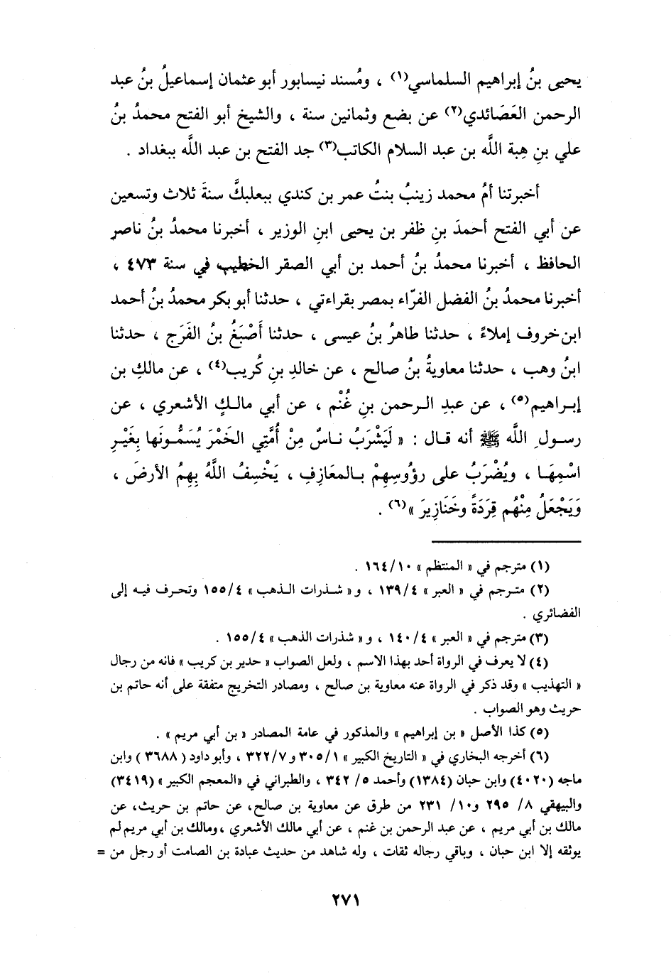 أَخْبَرَتْنَا أُمُّ مُحَمَّدٍ زَيْنَبُ بِنْت عُمَر بن كِندِي بِبَعْلَبَكَّ سَنَةَ ثَلاَثٍ وَتِسْعِيْنَ، عَنْ أَبِي الفَتْحِ أَحْمَدَ بنِ ظفر بن يَحْيَى بنِ الوَزِيْر، أَخْبَرَنَا مُحَمَّدُ بنُ نَاصر الحَافِظ، أَخْبَرَنَا مُحَمَّدُ بنُ أَحْمَدَ بنِ أَبِي الصَّقْرِ الخَطِيْب فِي سَنَةِ 473، أَخْبَرَنَا مُحَمَّدُ بنُ الفَضْلِ الفَرَّاء بِمِصْرَ بِقِرَاءتِي، حَدَّثَنَا أَبُو بَكْرٍ مُحَمَّدُ بنُ أَحْمَدَ بنِ خَرُوْف إِمْلاَءً، حَدَّثَنَا طَاهِر بن عِيْسَى، حَدَّثَنَا أَصْبَغ بن الفَرَجِ، حَدَّثَنَا ابْنُ وَهْبٍ، حَدَّثَنَا مُعَاوِيَةُ بنُ صَالِحٍ، عَنْ خَالِدِ بنِ كُرَيْبٍ (4) ، عَنْ مَالِكِ بنِ إِبْرَاهِيْمَ (5) ، عَنْ عَبْدِ الرَّحْمَنِ بنِ غَنْم، عَنْ أَبِي مَالِكٍ الأَشْعَرِيّ: