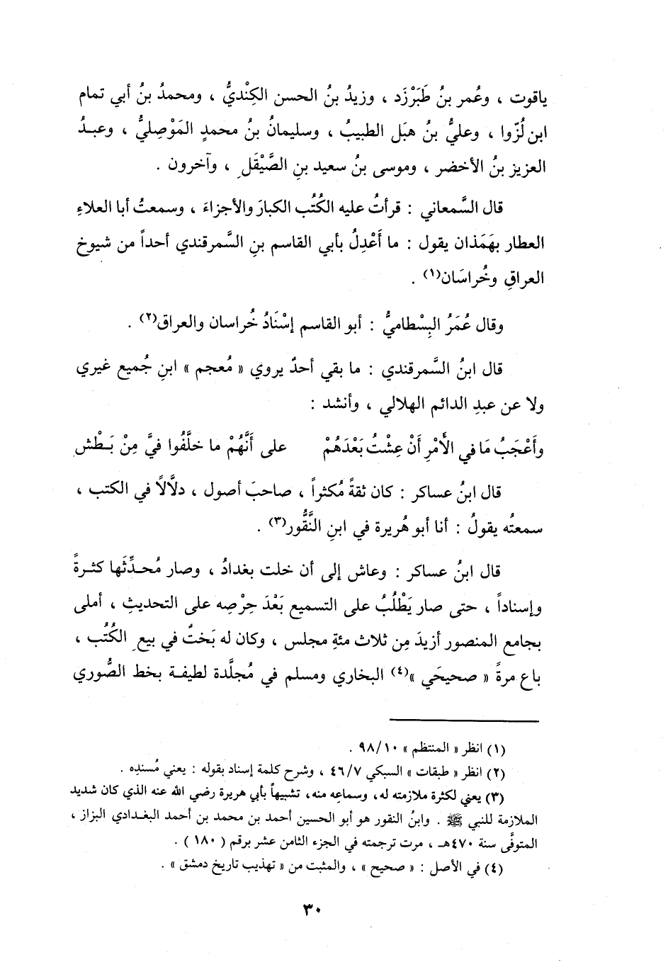 قَالَ ابْنُ عَسَاكِرَ: كَانَ ثِقَةً، مُكْثِراً، صَاحِبَ أُصُوْلٍ، دَلاَّلاً فِي الكُتُبِ، سَمِعْتُهُ يَقُوْلُ: أَنَا أَبُو هُرَيْرَةَ فِي ابْنِ النَّقُّوْرِ (3) .