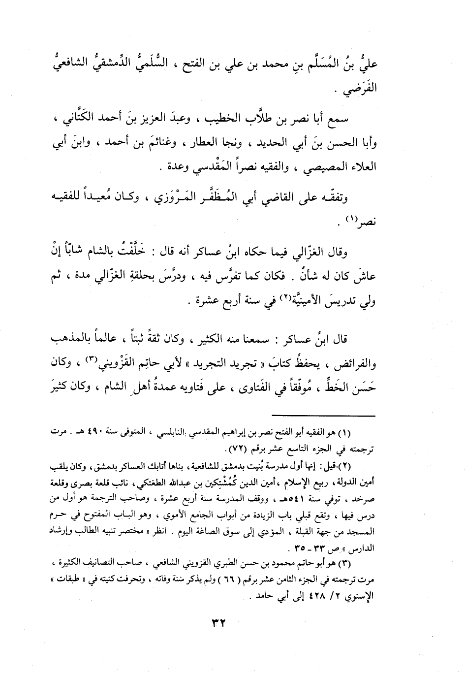 (1) هو الفقيه أبو الفتح نصر بن إبراهيم المقدسي النابلسي، المتوفى سنة 490 هـ. مرت ترجمته في الجزء التاسع عشر برقم (72) .