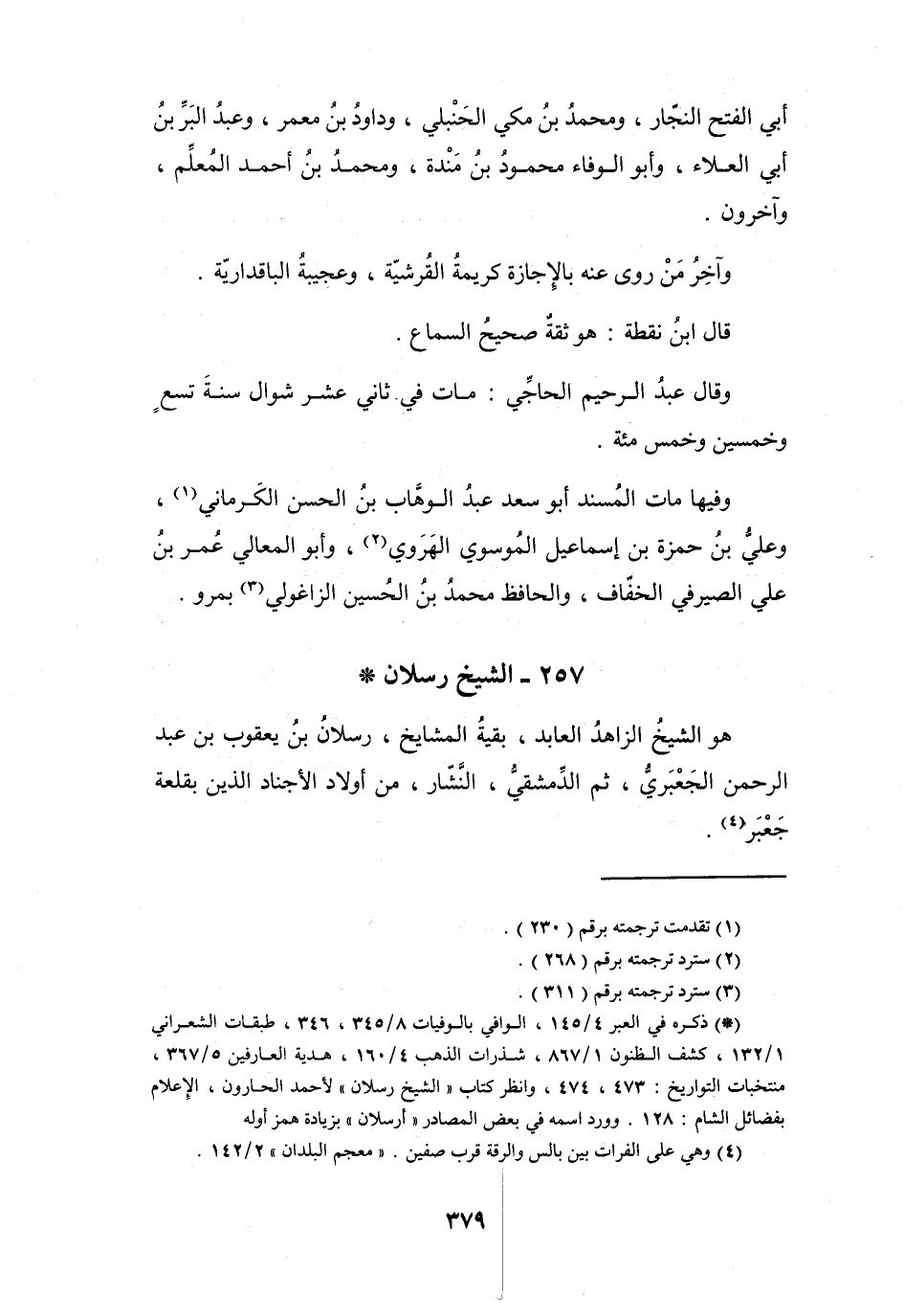 (*) ذكره في العبر 4 / 145، الوافي بالوفيات 8 / 345، 346، طبقات الشعراني 1 / 132، كشف الظنون 1 / 867، شذرات الذهب 4 / 160، هدية العارفين 5 / 367، منتخبات التواريخ: 473، 474، وانظر كتاب " الشيخ رسلان " لأحمد الحارون، الاعلام بفضائل الشام: 128.