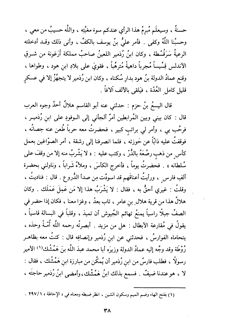 فَأَمرَ عَلِيُّ بنُ يُوْسُفَ بِالكَفِّ، وَأَنَّى ذَلِكَ، وَقَدْ أَدْخَلته الرعيَّةُ سَرَقُسْطَة، وَكَانَ ابْنُ رُذمِيْر اللعينُ صَاحِبُ مَمْلَكَةِ أَرَغُوْنَة مِنْ شرقِ الأَنْدَلُسِ قِسِّيْساً مُجَرَّباً، دَاهِيَةً مترهِّباً، فَقوِيَ عَلَى بِلاَدِ ابْنِ هودٍ وَطوَاهَا، وَقنعَ عمَادُ الدَّوْلَةِ بن هود بِدَارِ سُكْنَاهُ، وَكَانَ ابْنُ رُذمِيْر لاَ يَتَجَهَّزُ إِلاَّ فِي عَسْكَرٍ قَلِيْلٍ كَامِلِ العُدَّةِ، فَيَلقَى بِالأَلفِ آلاَفاً.