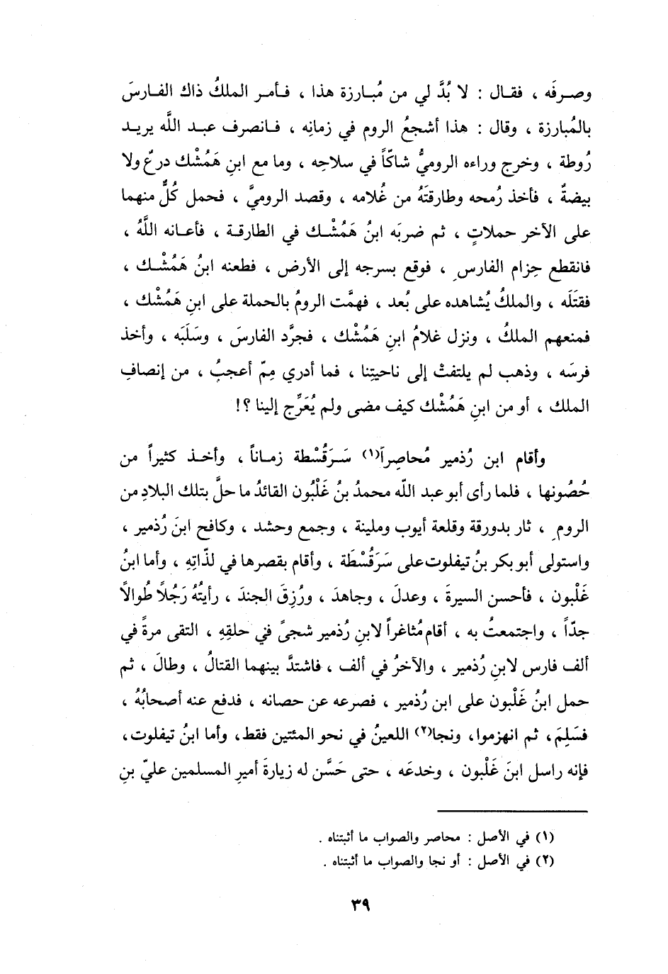 فَانْصَرَفَ عَبْدُ اللهِ يُرِيْدُ رُوطَةَ، وَخَرَجَ وَرَاءهُ الرُّوْمِيُّ شَاكّاً فِي سلاَحِه، وَمَا مَعَ ابْنِ هَمُشْك درعٌ وَلاَ بيضَةٌ، فَأَخَذَ رُمحَهُ وَطَارِقتَهُ مِنْ غُلاَمِهِ، وَقصدَ الرُّوْمِيَّ، فَحَمَلَ كُلٌّ مِنْهُمَا عَلَى الآخر حملاَت، ثُمَّ ضربَهُ ابْنُ هَمُشْك فِي الطَّارقَةِ، فَأَعَانَهُ اللهُ، فَانقطعَ حِزَامُ الفَارِس، فَوَقَعَ بسرجِهِ إِلَى الأَرْضِ، فَطعنه ابْن هَمُشْك، فَقَتَلَهُ، وَالملكُ يُشَاهِدُهُ عَلَى بُعْد، فَهمَّتِ الرُّوْمُ بِالحملَةِ عَلَى ابْنِ هَمُشْك، فَمنعهُم الملكُ، وَنَزَلَ غُلاَم ابْن هَمُشْك، فَجرَّدَ الفَارِسَ، وَسَلَبَهُ، وَأَخَذَ فَرسَهُ، وَذَهَبَ لَمْ يَلْتَفِتْ إِلَى نَاحِيَتِنَا، فَمَا أَدْرِي مِمَّ أَعْجَبُ: مِنْ إِنصَافِ الملكِ؟ أَوْ مِنِ ابْنِ هَمُشْك كَيْفَ مَضَى وَلَمْ يُعرِّجْ إِلَيْنَا؟!