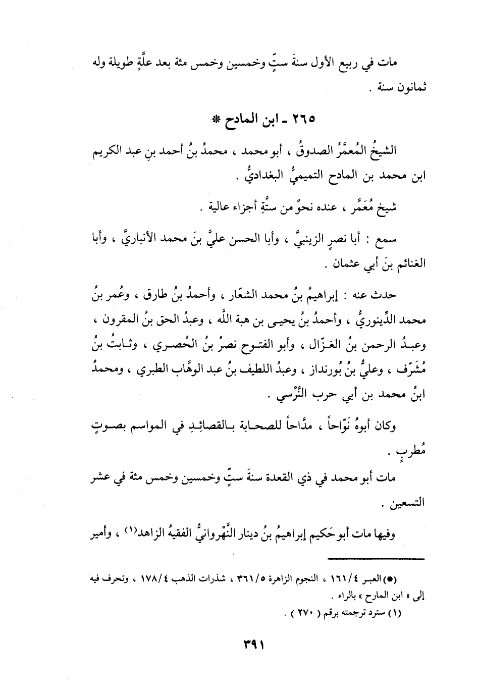 (*) العبر 4 / 161، النجوم الزاهرة 5 / 361، شذرات الذهب 4 / 178، وتحرف فيه إلى " ابن المارح " بالراء.