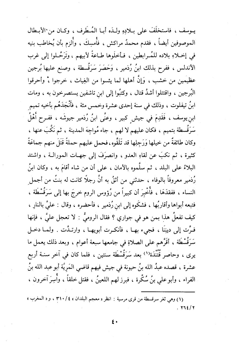 يُوْسُفَ، فَاسْتَخلفَ عَلَى بِلاَدِهِ وَلدَهُ أَبَا المُطَرِّفِ، وَكَانَ مِنَ الأَبْطَالِ المَوْصُوْفِيْن أَيْضاً، فَقَدِمَ مُحَمَّدٌ مَرَّاكُش، فَأُمسِكَ، وَأُلزِمَ بِأَنْ يُخَاطِبَ بَنِيهِ فِي إِخلاَءِ بِلاَدِهِ لِلمُرَابِطِيْنَ، فَأَخلَوهَا طَاعَةً لأَبِيْهِم، وَتَرَحَلُّوا إِلَى غربِ الأَنْدَلُسِ، فَفَرح بِذَلِكَ ابْنُ رُذمِيْر، وَحَصَرَ سَرَقُسْطَة، وَصنعَ عَلَيْهَا بُرْجَيْنِ عَظِيْمَينِ مِنْ خشبٍ، وَإِنَّ أَهْلهَا لَمَّا يَئسُوا مِنَ الغِيَاثِ، خَرَجُوا، وَأَحرقُوا البُرجَيْنِ، وَاقْتَتَلُوا أَشدَّ قِتَالٍ، وَكَتبُوا إِلَى ابْنِ تَاشفِيْنَ يَسْتَصرخونَ بِهِ، وَمَاتَ ابْنُ تيفلوت، وَذَلِكَ فِي سَنَةِ إِحْدَى عَشْرَةَ وَخَمْس مائَة، فَأَنجدَهُم بِأَخِيْهِ تَمِيْمِ بنِ يُوْسُفَ، فَقَدِمَ فِي جَيْشٍ كَبِيْرٍ، وَعَنَّى ابْنُ رُذمِيْر جُيُوْشَهُ، فَفَرح أَهْلُ سَرَقُسْطَة بِتَمِيْمٍ، فَكَانَ عَلَيْهِم لاَ لَهُم، جَاءَ مُوَاجِهَ المَدِيْنَةِ، ثُمَّ نَكَّبَ عَنْهَا، وَكَانَ طَائِفَةٌ مِنْ خَيلِهَا وَرَجِلِهَا قَدْ تَلَقَّوهُ، فَحَمَلَ عَلَيْهِم حَملَةً قَتَلَ مِنْهُم جَمَاعَةً كَثِيْرَةً، ثُمَّ نَكَّبَ عَن لقَاءِ العَدُوِّ، وَانْصَرَفَ إِلَى جهَاتِ المورَالَة، وَاشتدَّ البَلاَءُ عَلَى البلدِ، ثُمَّ سَلَّمُوْهُ بِالأَمَانِ، عَلَى أَنَّ مَنْ شَاءَ أَقَامَ بِهِ.