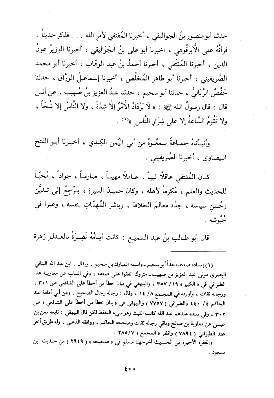 وَأَنْبَأَنَاهُ جَمَاعَة سَمِعُوْهُ مِنْ أَبِي اليُمْنِ الكِنْدِيِّ، أَخْبَرَنَا أَبُو الفَتْحِ البَيْضَاوِيّ، أَخْبَرَنَا الصَّرِيْفِيْنِيّ.