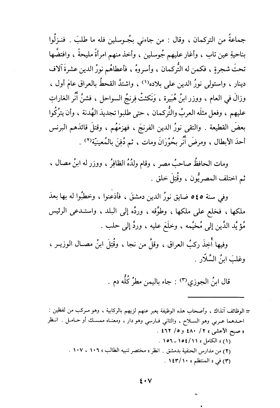 فَنَزَلُوا بِنَاحيَة عين تَابَ، وَأَغَار عَلَيْهِم جُوسلين، وَأَخَذَ مِنْهُم امْرَأَة مليحَة، وَافتضَّهَا تَحْتَ شَجَرَة، فَكمن لَهُ التُّرُكْمَانُ، وَأَسروهُ، فَأَعْطَاهُم نُوْر الدِّيْنِ عَشْرَة آلاَف دِيْنَار، وَاسْتَوْلَى نُوْر الدِّيْنِ عَلَى بِلاَدِه (1) ، وَاشتدَّ القَحط بِالعِرَاقِ عَام أَوّل، وَزَال فِي العَامِ، وَوزر ابْن هُبَيْرَةَ، وَنكثتْ فِرْنَج السوَاحل، فَشن أَنُر الغَارَات عَلَيْهِم، وَفعل مِثْلَه العربُ وَالتُّرُكْمَان، حَتَّى طلبُوا تَجديد الهُدنَة، وَأَنْ يَتركُوا بَعْض القطيعَة.